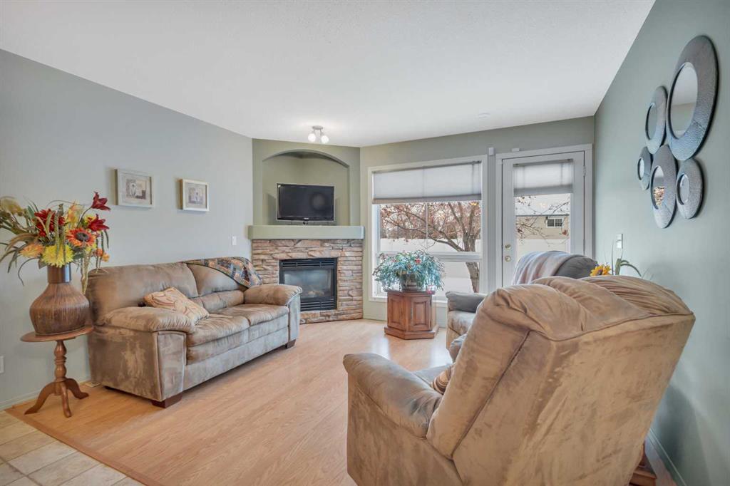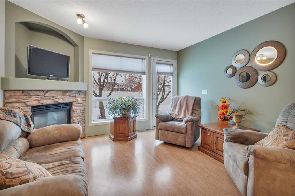 Welcome to this well-kept bungalow-style townhouse in the private adult community of Springfield Crossing in Red Deer, where low-maintenance living meets a quiet, friendly setting. This fully finished middle unit offers the convenience of an attached single garage and a bright, open-concept layout that feels comfortable the moment you step inside. The sunny living room is anchored by a corner stone mantel gas fireplace with a built-in TV nook, creating a warm and welcoming space to relax. Garden doors lead you to your patio overlooking a green space. The kitchen is both spacious and functional, featuring white appliances and a corner pantry for added storage. The main floor includes two bedrooms—one easily used as a den or home office—along with a full 4-piece bathroom and convenient main floor laundry. Downstairs, the fully developed basement provides additional living space with a rec room,