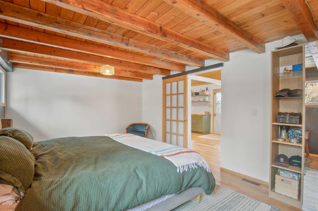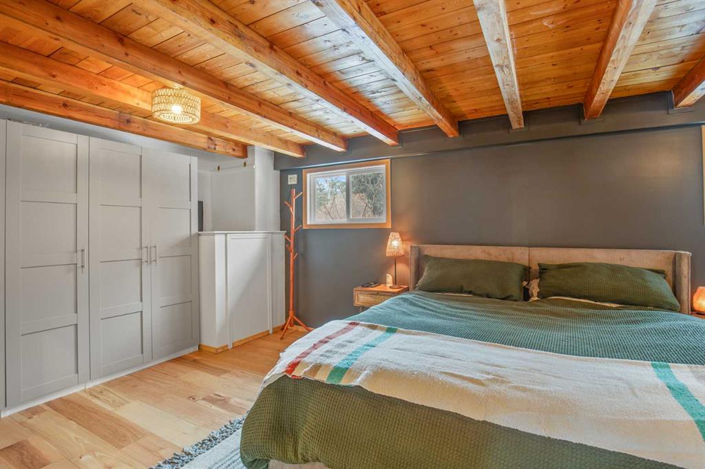 The spacious primary bedroom offers a cozy, character-filled retreat with exposed beams and a calm, relaxed atmosphere. The fully renovated bathroom combines style and function with a tiled shower and glass enclosure, modern vanity, and a well-designed laundry space with butcher block countertops—finished with a bold feature wall that adds a unique touch.