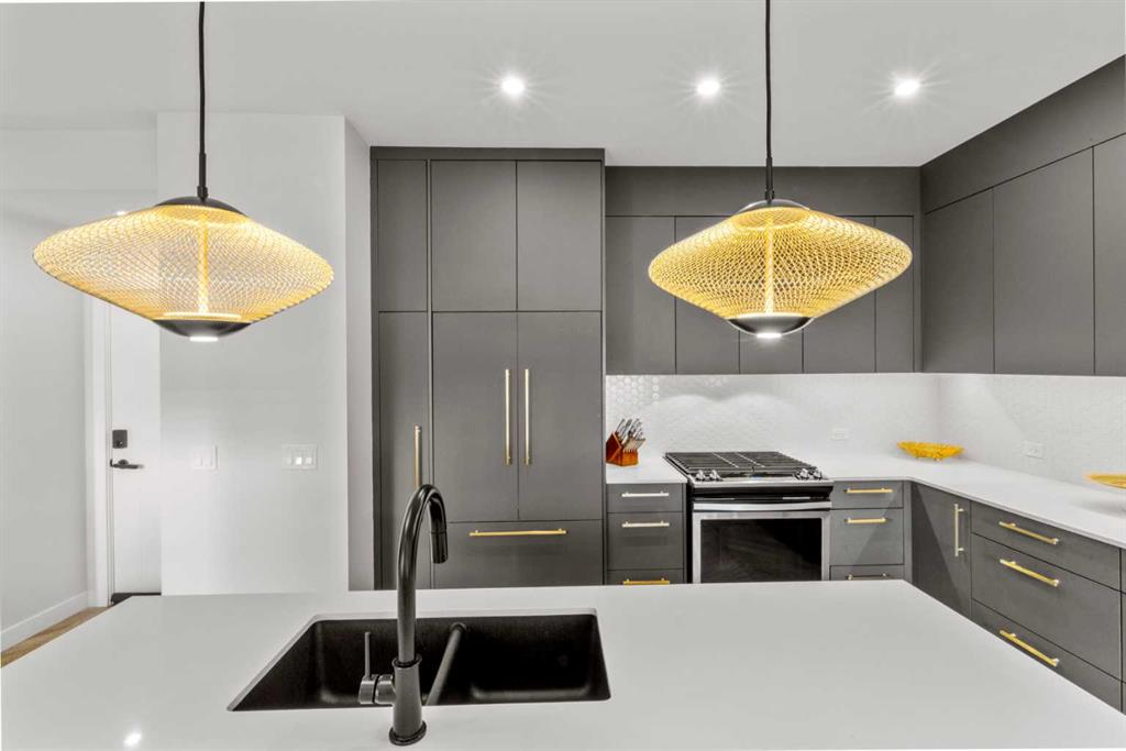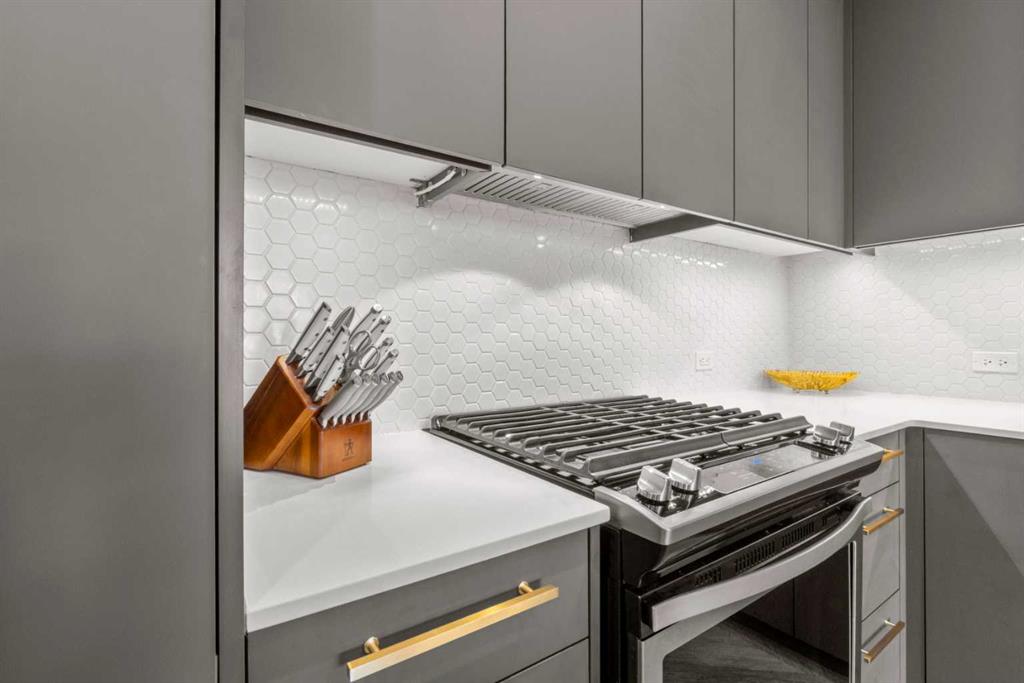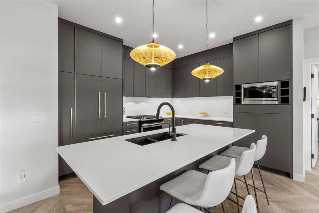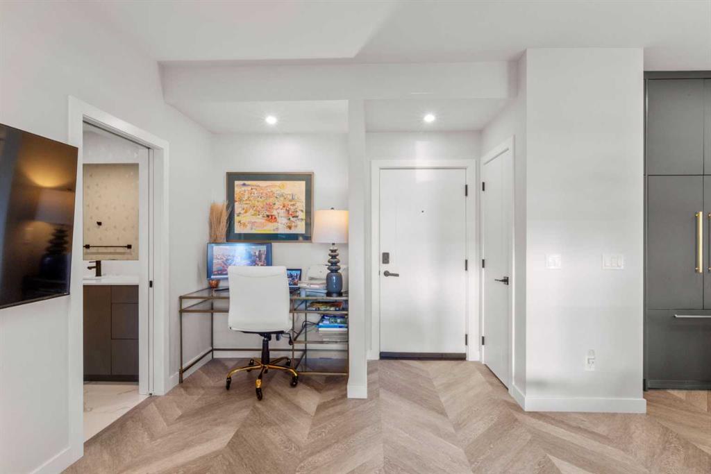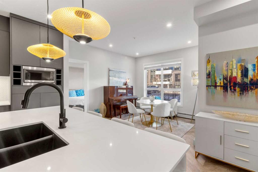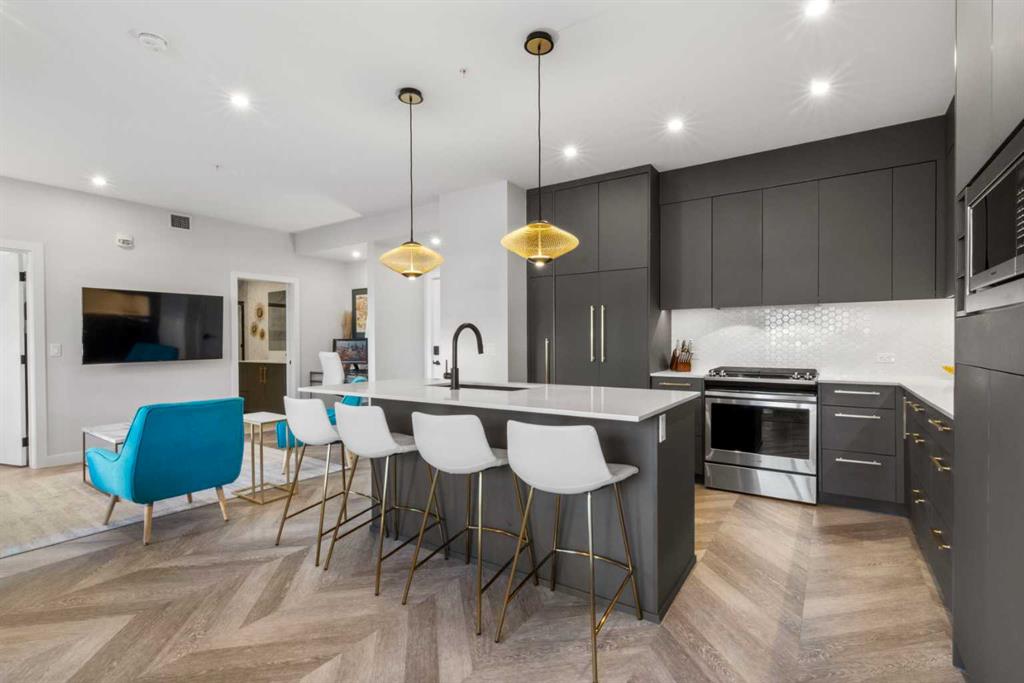 Welcome to Esquire in the heart of University District, where modern design meets a vibrant, walkable lifestyle. This ground floor unit offers next level convenience with the ability to come and go directly through your private patio, giving it a rare, almost townhome feel. Inside, the space is fresh, stylish and anything but ordinary, featuring eye catching herringbone vinyl plank flooring that runs throughout. The kitchen is a true showpiece with a large quartz island perfect for casual dining or entertaining, full height cabinetry and sleek, contemporary finishes that elevate the entire space. The open living area is bright and inviting, while both bedrooms are thoughtfully positioned on opposite sides of the living space, creating a highly functional layout with exceptional privacy. The primary bedroom feels like a retreat with a walk through closet leading to a beautifully finished ensuite complete with quartz countertops and a large walk in shower. A second spacious bedroom is ideally positioned with easy access to another full four piece bathroom, making the layout both functional and flexible. Step outside to your private patio, tucked between brick walls for added privacy, with green space out front that gives a rare sense of yard like living. Additional features include two storage lockers and a titled underground parking stall. Residents of Esquire enjoy access to a full range of amenities including a fitness centre, pet wash station, bike storage and tuning area and a workshop. All of this just steps from the University of Calgary, Alberta Children’s Hospital, Market Mall, Central Commons Park, dog parks, cafes, restaurants, grocery stores and the Cineplex VIP theatre, with easy access to transit and major routes. This is a standout opportunity to own a modern, ground level home in one of Calgary’s most dynamic and connected communities.