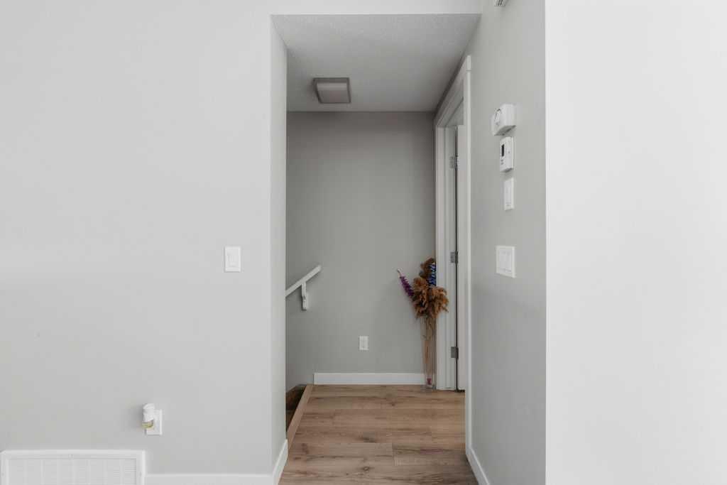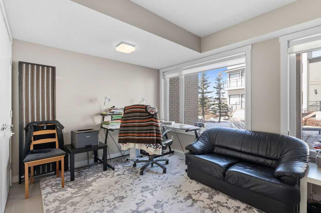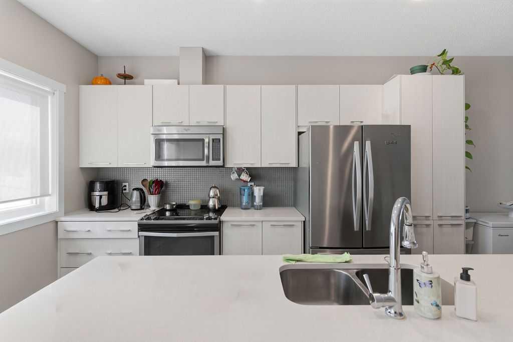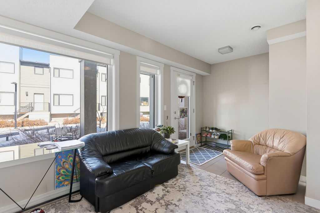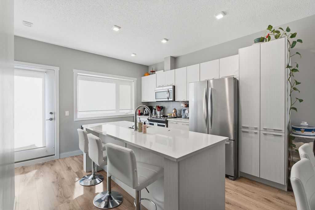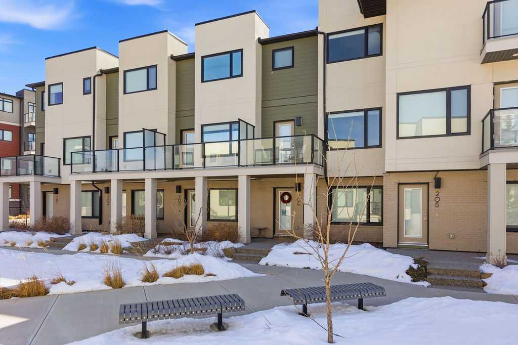 Welcome to this stunning and beautifully appointed townhome in the highly desirable Diseno community of Sherwood. Offering 1,576 sq. ft. of thoughtfully designed living space, this home seamlessly blends modern style, comfort, and functionality—ideal for families, professionals, or those seeking low-maintenance living without compromise. The main level welcomes you with a bright and spacious flex room, perfectly suited for a home office, gym, or guest space. Large windows fill the area with natural light while showcasing peaceful views of the surrounding greenspace, creating an inviting and versatile environment. This level also provides convenient access to the double attached garage, making everyday living effortless. Upstairs, the second level reveals an impressive open-concept layout designed for both relaxing and entertaining. The spacious living room is anchored by natural sunlight, creating a warm and welcoming atmosphere. The adjacent dining area flows seamlessly into the contemporary kitchen, which is sure to impress with its sleek quartz countertops, stainless steel appliances, modern cabinetry, stylish backsplash, and a large island with breakfast bar seating—perfect for casual dining or hosting guests. A standout feature of this home is the presence of two private balconies—one off the living room and another off the kitchen—both offering tranquil pond and greenspace views. These outdoor spaces provide the perfect setting to enjoy your morning coffee or unwind in the evening. The upper level is thoughtfully laid out to maximize comfort and privacy. The spacious primary bedroom serves as a relaxing retreat, complete with a walk-in closet and a private 3-piece ensuite with a stand-up shower. Two additional generously sized bedrooms offer flexibility for family, guests, or workspace, and are complemented by a full 4-piece bathroom. Convenient in-suite laundry on this level adds to the home’s overall practicality. Situated in the sought-after community of Sherwood, this home offers exceptional access to nearby amenities, including Beacon Hill and Sage Hill shopping centres, schools, public transit, parks, and an extensive network of walking paths. With quick access to major roadways, commuting is simple and efficient. Combining a functional layout, modern finishes, beautiful views, and a prime location, this exceptional townhome presents a rare opportunity to enjoy elevated living in one of NW Calgary’s most desirable communities.