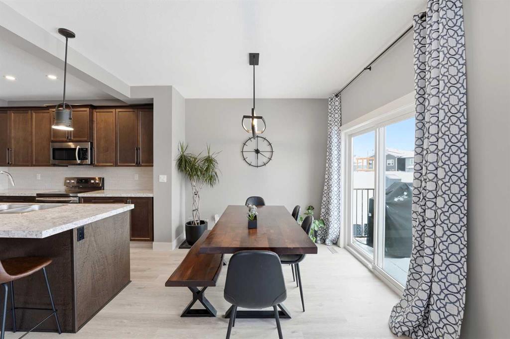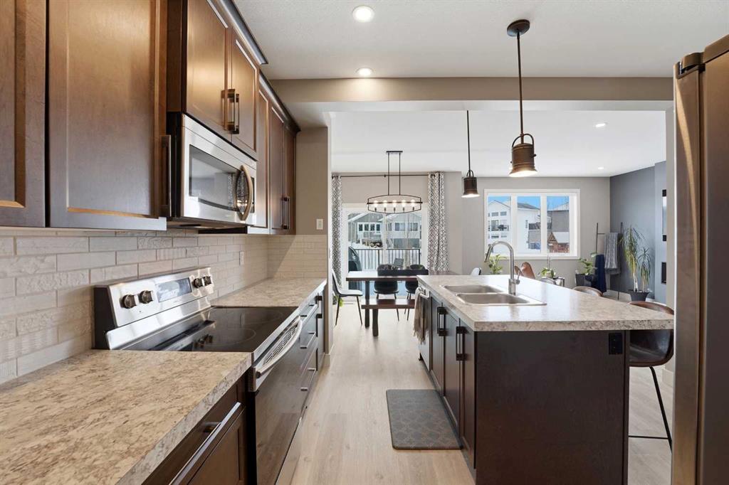 A fully developed two storey in Laredo! The tiled front entryway greets you to the open style floor plan. Maple kitchen cabinets are accented by crown mouldings, an eating bar island, full tile backsplash, stainless steel appliances and a walk in pantry. The eating area has patio doors to the wood deck that features aluminum railings. Relax in the living room next to the electric fireplace. Brand new vinyl plank flooring was just installed throughout the main floor. Follow the vinyl plank stairs with wrought iron railings upstairs. The king sized primary bedroom has a fan, carpet, a walk in closet and a 4 piece ensuite with drawers and a window. There are 2 additional bedrooms, a 4 piece bathroom and a bonus room that could be used as a 5th bedroom (no closet). The basement is warmed by underfloor heating with a 4th bedroom, a 3 piece bathroom and a family room with vinyl plank flooring (new flooring in 2025). The south west facing backyard is landscaped with an interlocking stone patio, a firepit, a gazebo, a shed and vinyl fencing. The garage has a drain, rough in for a gas heater and central vac. The home has A/C. A great location within walking distance to the pond and path system.