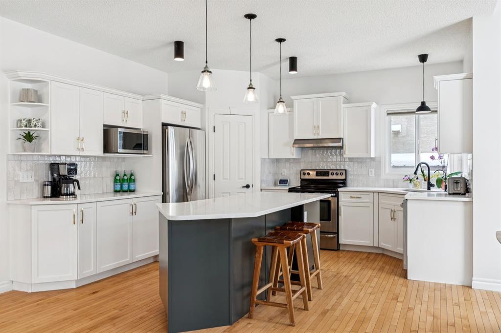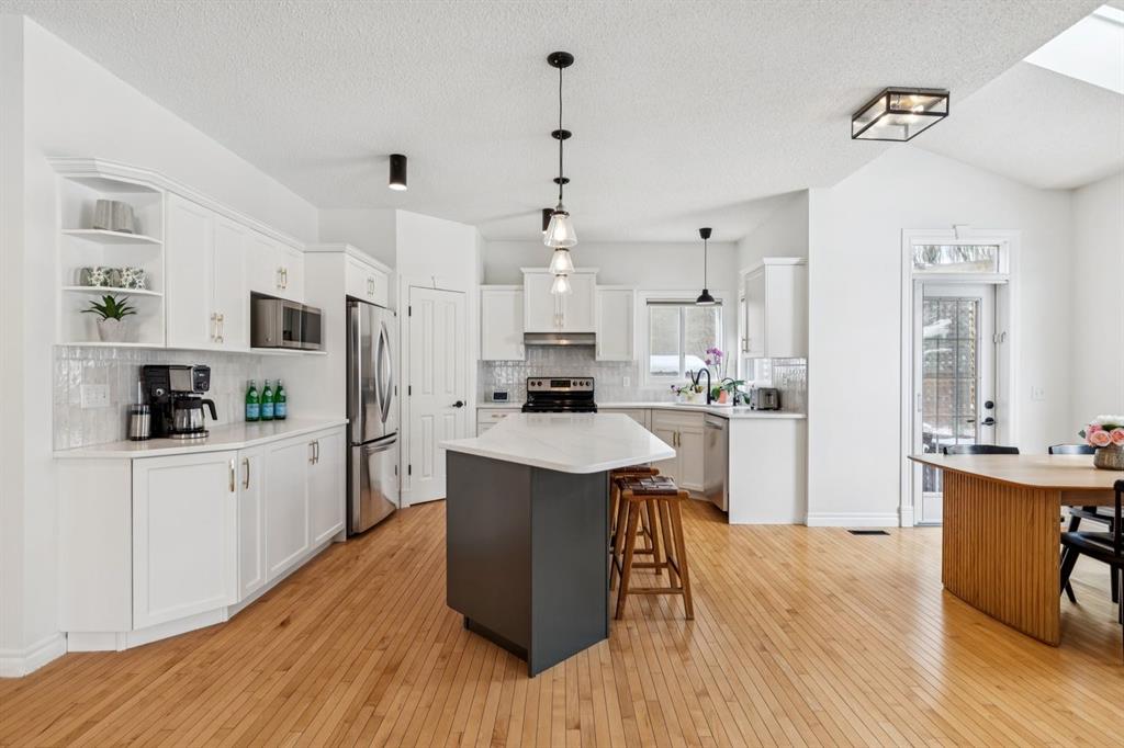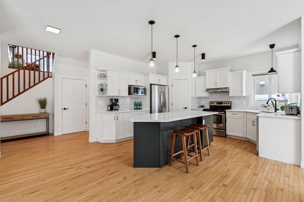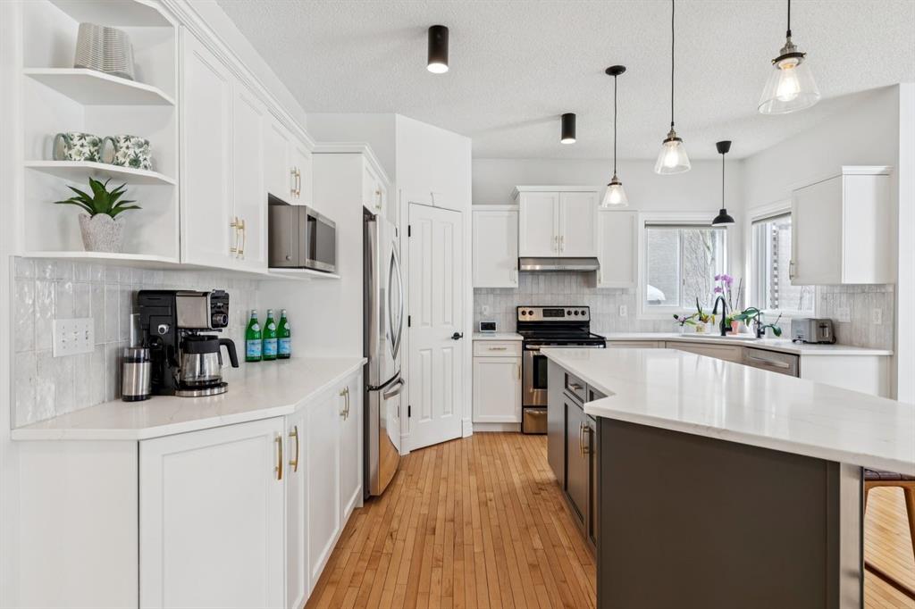 Located in the desirable pocket of Tuscany Estates, this move-in-ready home offers an open floor plan with upgrades throughout. Situated on a quiet street, the property provides convenient access to walking paths, schools, and Lynx Ridge Golf Course. The bright, open-concept main floor features large west-facing windows, 9-foot ceilings, air conditioning, new roof 2024 and three skylights. Notable upgrades include newer paint, quartz countertops, updated maple cabinets, hardwood floors, and modern light fixtures. The kitchen opens to a formal dining room and a generous living room centered around a double-sided fireplace. This level also includes a large office/den, a mudroom, a two-piece bathroom, and access to the attached two-car garage. The upper level has hardwood floors and features a large, east-facing bonus room with vaulted ceilings and custom-paneled wainscoting. The primary retreat offers west-facing windows, a walk-in closet, and a five-piece ensuite with a soaker tub and dual vanities. Two additional bedrooms and a four-piece bathroom complete this floor. The recently finished lower level provides a large recreation space, potential for a fourth bedroom, and two substantial storage rooms. Outside, the mature, west-facing backyard includes a secluded deck and a brick patio, perfect for outdoor dining or a firepit, all overlooking a spacious landscaped yard.