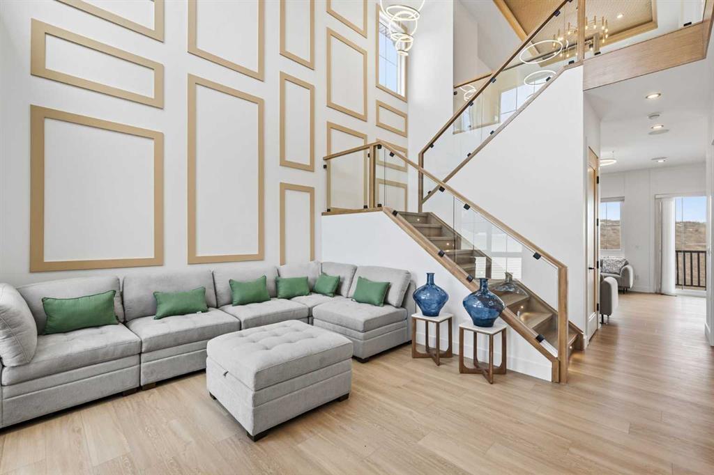 Backing onto greenspace with direct access to biking and walking trails, this expansive custom built 5+3 bedroom home with a FULLY DEVELOPED WALK OUT BASEMENT offers over 4,600 sq ft of beautifully designed living space. The main level features luxury vinyl plank flooring, soaring ceilings, and stylish lighting throughout. A dramatic front living room with a towering ceiling flows into a welcoming family room, highlighted by a floor to ceiling feature wall with fireplace. This open concept continues into the spacious dining area and the stunning kitchen, complete with a waterfall island/eating bar, abundant cabinetry, a high end appliance package, and a fully equipped spice kitchen/butler’s pantry. A generous main floor bedroom with its own private 3 piece ensuite is ideal for guests or multi generational living. An office tucked quietly down the hall provides an excellent work from home space, and a 2 piece powder room completes the level. Upstairs, a central bonus room anchors the second floor, which hosts four additional bedrooms—two with private ensuites—along with a 3 piece Jack & Jill bath and a convenient laundry room. The primary retreat impresses with a dramatic tray ceiling, a walk in closet, and a luxurious 5 piece ensuite featuring dual sinks, a relaxing soaker tub, and a separate shower. The walk out basement is perfectly suited for extended family living, offering its own spacious living room with a floor to ceiling feature fireplace and built ins, a dining area, and a well appointed kitchen with quartz countertops, an eating bar, ample cabinetry, and stainless steel appliances. Three sizeable bedrooms (including one with a 4 piece ensuite), a 4 piece main bath, and private laundry facilities complete this level. Additional highlights include central air conditioning, Smart Home features, and built in speakers. Outdoors, enjoy a back deck overlooking the greenspace, a covered patio, and effortless parking with a triple attached garage. This exceptional property is close to schools, shopping, parks, and public transit, with quick access to Country Hills Blvd and Stoney Trail—offering convenience, space, and a rare connection to nature.