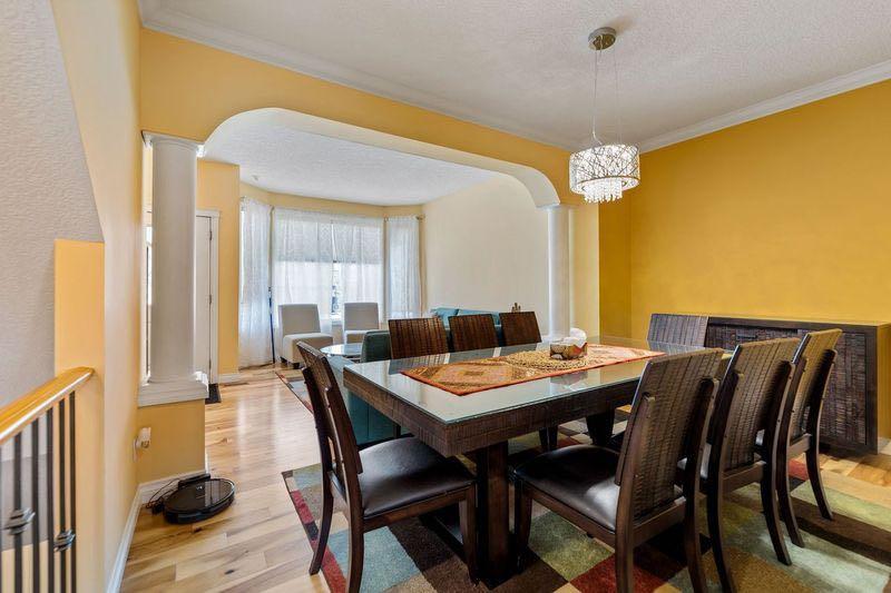 Welcome to this spacious and beautifully upgraded 6-bedroom, 3.5-bathroom walkout home backing onto a serene ravine, offering the perfect blend of privacy, comfort, and functionality. The main floor boasts an open and inviting layout, featuring a bright living room, a cozy family room, a formal dining area, and a sunny breakfast nook that overlooks the ravine. The kitchen is a chef’s dream, complete with solid wood cabinetry, granite countertops, stainless steel appliances, and a stylish insert hood fan. A deck overlooking the ravine is ideal for enjoying your morning coffee. A private office offers a quiet space for work, and the convenient half bath rounds out this well-appointed floor. Upstairs, the large master bedroom with a walk-in closet is a true retreat, featuring a luxurious 5-piece ensuite. The upper level offers 3 additional good-sized bedrooms and another full bathroom, making this home ideal for growing families. The fully finished walkout basement includes two more bedrooms, a full bath, kitchen, a large living area with projector electrical fittings and a covered porch - an illegal suite with a private entrance and excellent potential for legal conversion. The backyard is a great space to enjoy the summers and winters alike. Additional upgrades include a new roof (2025), upgraded hardwood flooring, central A/C, and an insulated, drywalled double garage. Ideally located in a family-friendly neighborhood, this home is just a short walk to Creekside Shopping Centre, SageHill Shopping Centre, Public transit, parks, and offers easy access to Stoney Trail—making daily commutes and errands a breeze. The house is located a short walk from a soccer and a baseball field that gets converted to an ice rink in the winters. This property boasts a bike, transit and amenity score of a 100. This is an excellent opportunity to own a move-in-ready home in a highly desirable and amenity-rich community.