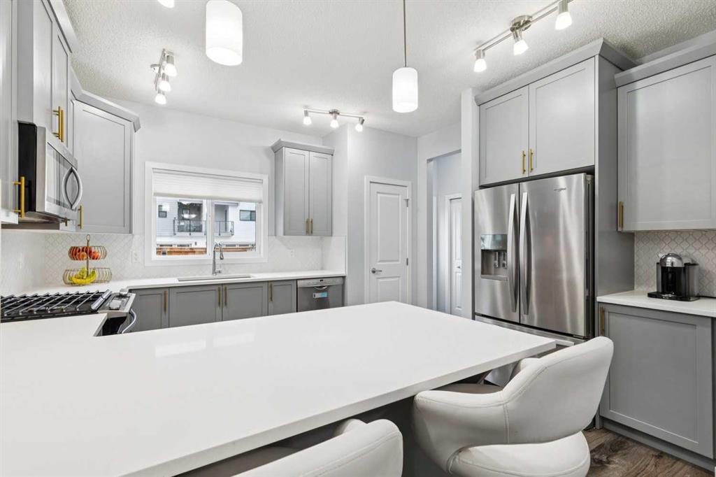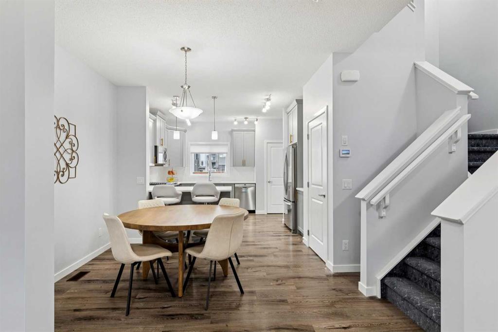 OPEN HOUSE - Sunday April 19, 12:30-2:30 - This unique two-and-a-half storey home in the heart of Mahogany offers the perfect blend of space, function, and style. A large, welcoming front porch sets the tone, leading into a spacious foyer with a practical pony wall that keeps everyday clutter tucked away from the main living space. The living room is warm and inviting with a gas fireplace, large windows that fill the home with natural light, and tasteful floating shelves that add character. The open-concept layout continues into a generous dining area, ideal for family meals or entertaining, and flows seamlessly into a bright kitchen featuring a large U-shaped counter, full-size appliances, pantry storage, and modern cabinetry accented with stylish gold details. Just around the corner, a convenient half bath and access to the fully fenced backyard make daily living easy, while the large deck and rear parking pad for two vehicles add even more functionality. Upstairs, the first upper level offers three bedrooms, including a primary retreat with a walk-in closet and private ensuite, while the other two bedrooms share a 4pc guest bath. Laundry on this floor also adds utmost convenience for families. The top floor creates a standout private space with an additional bedroom, full bathroom, and a versatile den—perfect for a playroom, home office, or quiet retreat. Recent upgrades, including new EVP flooring on the second and third floors (2025) and new carpet on the stairs (2025), bring a fresh, modern feel throughout. The unfinished basement is ready for your future vision. Living in Mahogany means access to one of Calgary’s most sought-after lake communities, known for its beautiful pathways, vibrant amenities, and year-round recreation. Residents enjoy exclusive lake access, nearby schools, shopping, dining, and an active, welcoming neighbourhood atmosphere that makes it easy to feel at home.