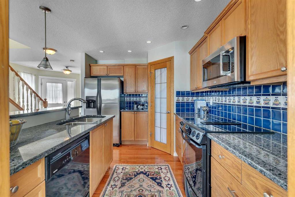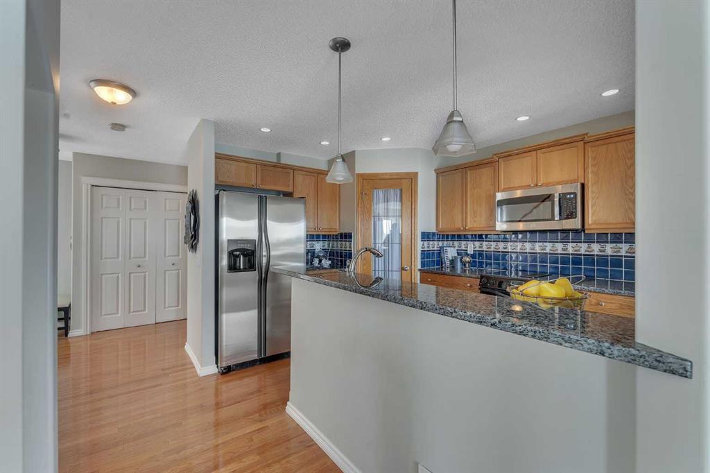 OPEN HOUSE THIS SATURDAY APRIL 25 FROM 1-3 PM! Exceptionally rare opportunity to own an AIR-CONDITIONED END UNIT townhome with an OVERSIZED DOUBLE GARAGE (24X19). and a WALKOUT basement! This lovely property sits atop the ridge and offers UNOBSTRUCTED VIEWS of the park beyond. With a fully finished WALKOUT basement, the NATURAL LIGHT is simply spectacular on every level. Inside, you\'ll appreciate the solid hardwood floors, and the modern kitchen with stone counters. The spacious dining room has doors that lead to a full width walkout deck. The living room has custom built-ins + a gas fireplace and an abundance of windows. With over 2200 square feet of developed living space, this is a well laid-out design. Upstairs, the primary suite is well appointed with a walk-in closet and a 4 piece ensuite. A second large bedroom with a sitting area is on the opposite end, with UPPER LAUNDRY, and a 4 piece bath completing this level. The basement offers a large rec room with a cozy gas fireplace and sliding doors that lead to a back patio. A 3rd room and a 3 piece bath finish off the basement. The backyard is fenced with a green space and access to the park beyond. This is a well run complex with a reserve fund over $800,000 as of February 2026. Pet-friendly complex, subject to Board approval. Any replacement of exterior windows or doors are the responsibility of the corporation. Replacement is slated for 2027 and 2028 according to the reserve fund. Condo fees are $389.02/month. Available for immediate occupancy. This is by far the best location in the complex!