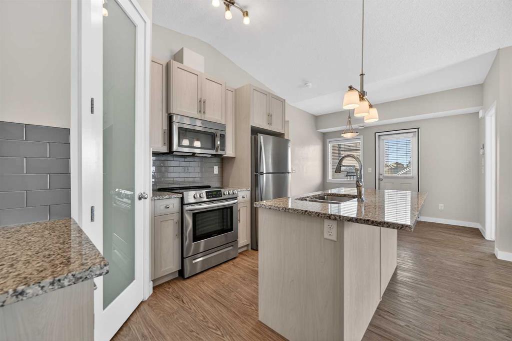 TOP FLOOR CORNER UNIT | | HIGH CEILINGS | OPEN PLAN | PRIVATE DECK! These are ALL AMAZING FEATURES of this beautifully appointed townhouse in Meridian 114! This well maintained townhouse offers an OPEN FLOOR PLAN featuring a large KITCHEN WITH ISLAND AND SEATING BAR, ample counter space with gleaming QUARTZ COUNTERS! Enjoy STAINLESS STEEL APPLIANCES and gorgeous tile back splash lending to a clean modern palette. The SPACIOUS DINING ROOM comfortably accommodates a good sized table for family dinners and the Great Room is a perfect size allowing for larger furniture as a fantastic space to entertain! This townhouse features 2 LARGE BEDROOMS - the PRIMARY BEDROOM is your private oasis with a 3 PIECE ENSUITE with QUARTZ COUNTERS, LARGE SHOWER and large WALK-IN CLOSET! The 2nd bedroom also has a large closet for your younger fashionista with a 2ND FOUR PIECE BATH steps down the hall also featuring quartz counter, shower and tub to wind the day away! Convenience is key with this well thought out floor plan with a stacked LAUNDRY CLOSET in the hall and STORAGE is a breeze when it\'s discretely tucked away with it\'s own door to keep things out of plain view. LUXURY VINYL PLANK FLOORING throughout is easy to maintain and is extremely pet friendly. LARGE WINDOWS allow for natural sunlight all day long for a bright and inviting vibe! This townhouse is located in the most perfect spot with a PARK | GREENSPACE just 10 steps from your front door and your ASSIGNED PARKING SPOT is right beside your townhouse with your vehicle viewable from your dining room and deck! You couldn\'t ask for more...low condo fees, excellent location on the TOP FLOOR lends to tons of privacy. Surrounded by tons of amenities, schools, green space, bike paths and access to major routes and Deerfoot Trail in just a few minutes. Pets are welcome with Board Approval! COME SEE..........