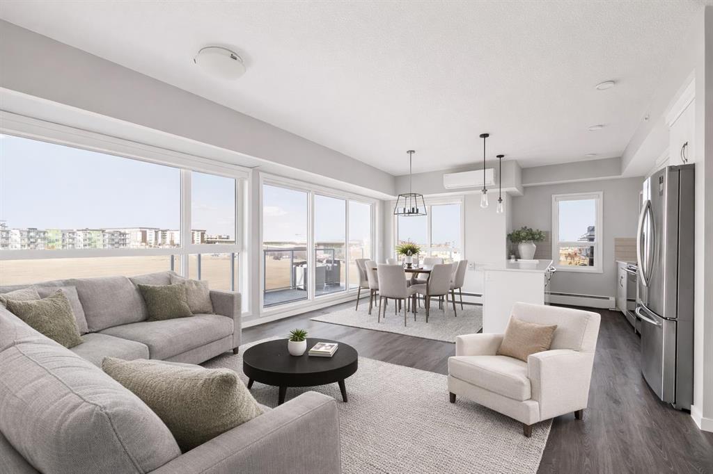 Welcome to Unit 409 at 4350 Seton Drive SE. This beautifully appointed top-floor corner unit has one of the best locations in the building, offering incredible views west, north and east from its private balcony, overlooking the 16-acre park. Located in the heart of the vibrant Seton Urban District, this move-in ready condo features nearly 850 sq. ft. of thoughtfully designed living space. This sun-drenched corner unit features 2 bedrooms and 2 bathrooms, delivering the perfect blend of comfort, style, and low-maintenance living. Step inside to discover a bright and airy open-concept layout, where oversized windows flood the home with natural light from every angle. Designed with both everyday living and entertaining in mind, the seamless flow between the kitchen, dining, and living areas creates an inviting and functional space. The modern kitchen offers timeless white cabinetry, a large peninsula with additional seating, quartz countertops and full-height cabinets, making it as practical as it is stylish. The primary bedroom serves as a private retreat, complete with its own double sided walkthrough closet and private ensuite featuring a walk-in shower. The second bedroom is on the opposite side of the unit, maximizing privacy while providing flexibility for guests, a home office, or additional living space. A second full bathroom ensures added convenience for both residents and visitors. Additional highlights include air conditioning for year-round comfort and a spacious in-suite laundry room that makes daily living effortless. Step outside onto your private balcony - the perfect spot for morning coffee, evening drinks, or summer BBQs - all while enjoying elevated views from this top-floor unit overlooking the 16 acre park. This home also includes a Titled secure underground parking stall, a dedicated storage locker, and access to a bike room, offering both convenience and peace of mind. Located in one of Calgary’s most dynamic communities, you’re just a short walk from the Seton YMCA, South Health Campus, and a wide variety of shopping, dining, and entertainment options, including Cineplex and everyday essentials. Combining location, lifestyle, and modern design, this is condo living at its finest. This unit offers the perfect opportunity for first time buyers, investors, or those looking to downsize without compromise. With no neighbours above you, and incredible year-round views, this top-floor unit provides maintenance-free single level living at an affordable price, just steps from countless amenities.