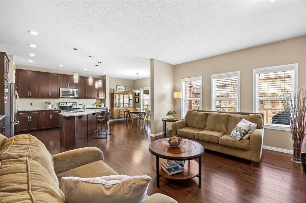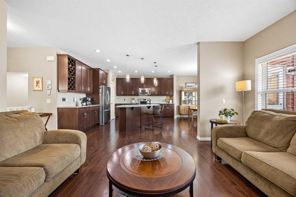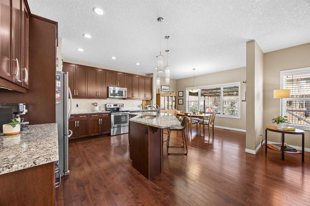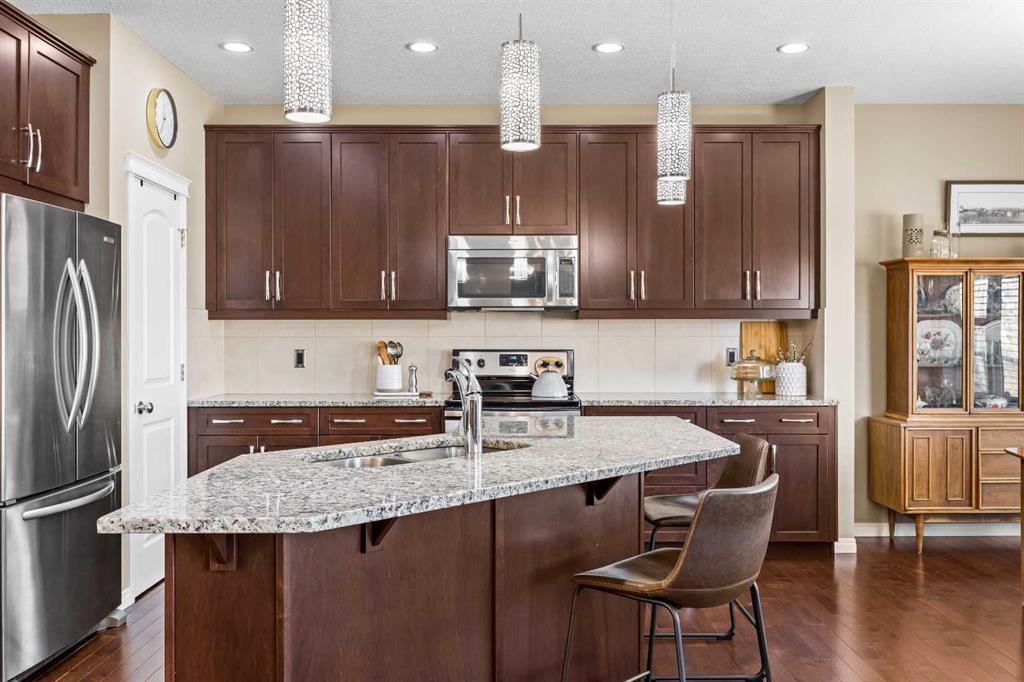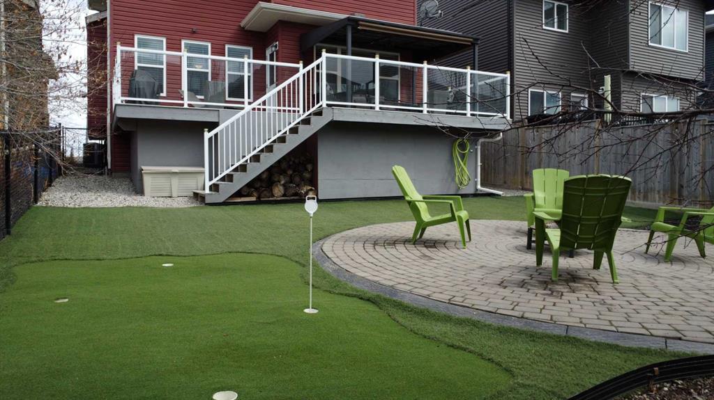 This home has a great layout and outdoor space with low-maintenance turf backyard designed for easy living, complete with rock features, a full-width deck with pergola and BBQ gas line, and your very own putting green—perfect for relaxing evenings or entertaining friends. Inside offers a bright, open-concept main floor featuring hardwood floors, generous kitchen with granite countertops, stainless steel appliances, a walk-in pantry, and a large one-level island. The dining area is large enough for a big table and buffet. The living room features a gas fireplace with TV mount above. The steps down into mudroom and half-bath area give a touch of unique architechture. Upstairs offers a thoughtfully designed layout with two bedrooms at the front—both with walk-in closets—a full main bath, central bonus room and laundry, and a spacious primary suite at the back featuring a large walk-in closet and a 5-piece ensuite. The fully finished basement provides a wide open rec room, a third full bathroom, and the flexibility to easily add a fourth bedroom if desired, along with excellent storage throughout. The oversized heated garage is extended in depth, making it ideal for trucks or additional workspace. With air conditioning, pride of ownership throughout, a location just minutes to D’Arcy Ranch Golf Club, plus parks, pathways, playgrounds, and your own putting green in the back yard, this home has much to offer!