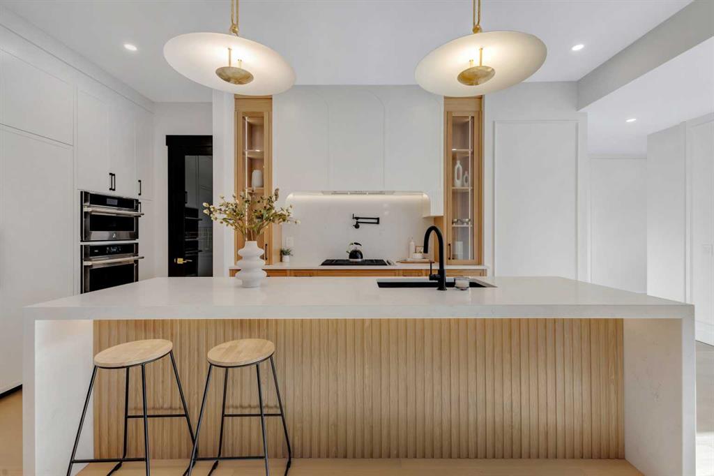 At the centre of the home, the kitchen stands as both a statement piece and a highly functional workspace. Quartz countertops, custom oak and white cabinetry, matte black fixtures, and a sculptural arched hood fan are complemented by a full JennAir appliance package, including a gas range. A pot filler and abundant storage support everyday use, while a hidden prep kitchen with a second sink, additional cabinetry, and open shelving allows the main kitchen to remain effortlessly clean and composed.