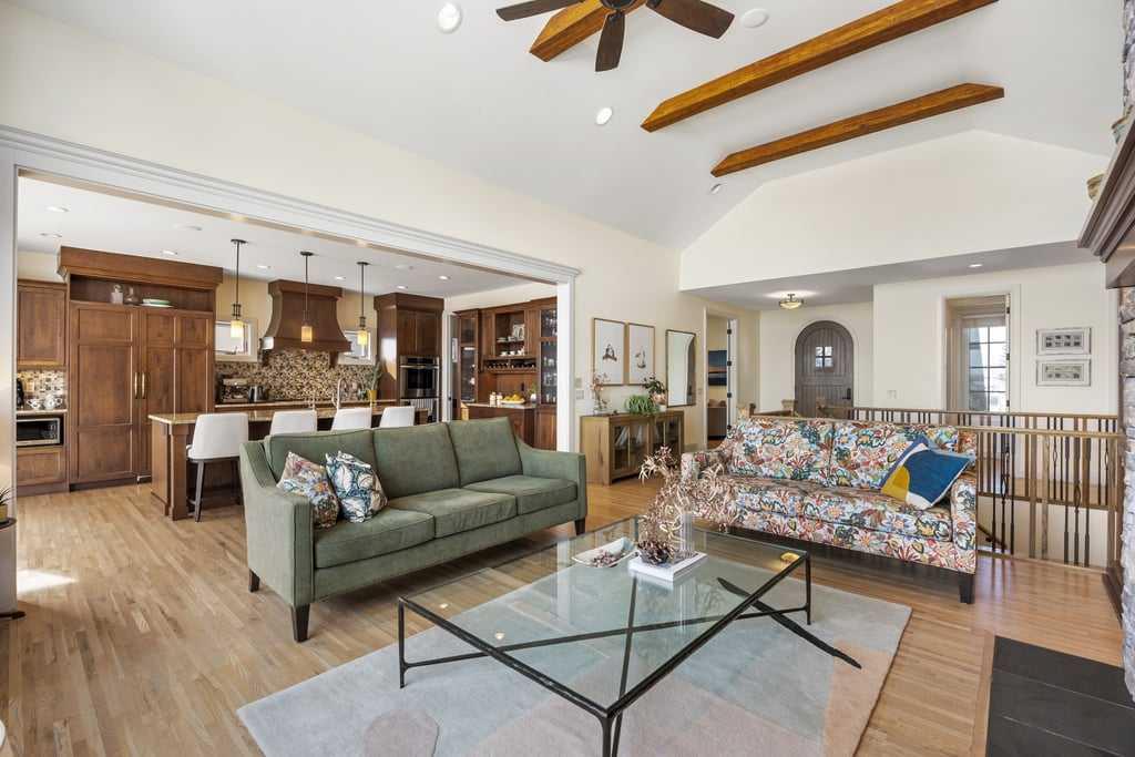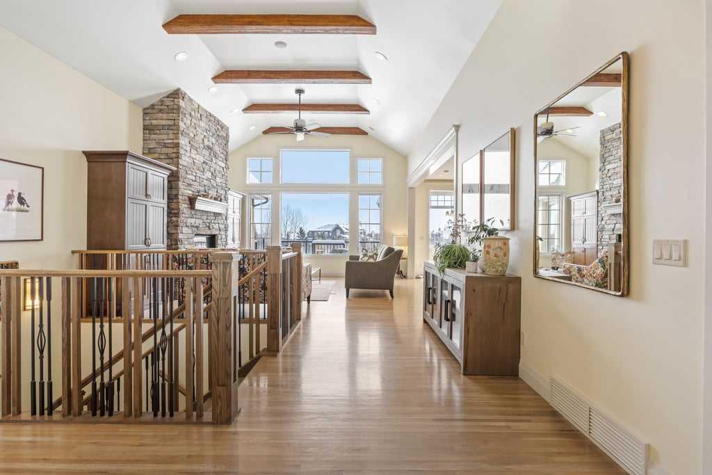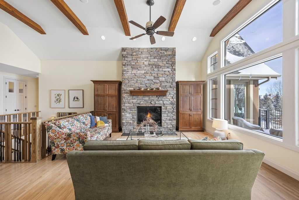 A curved driveway winds through mature landscaping, creating a strong sense of arrival as the home comes into view. Inside, soaring vaulted ceilings with exposed beams and rich hardwood floors set the tone in the main living area, where a striking stone fireplace anchors the space and invites both quiet evenings and larger gatherings.