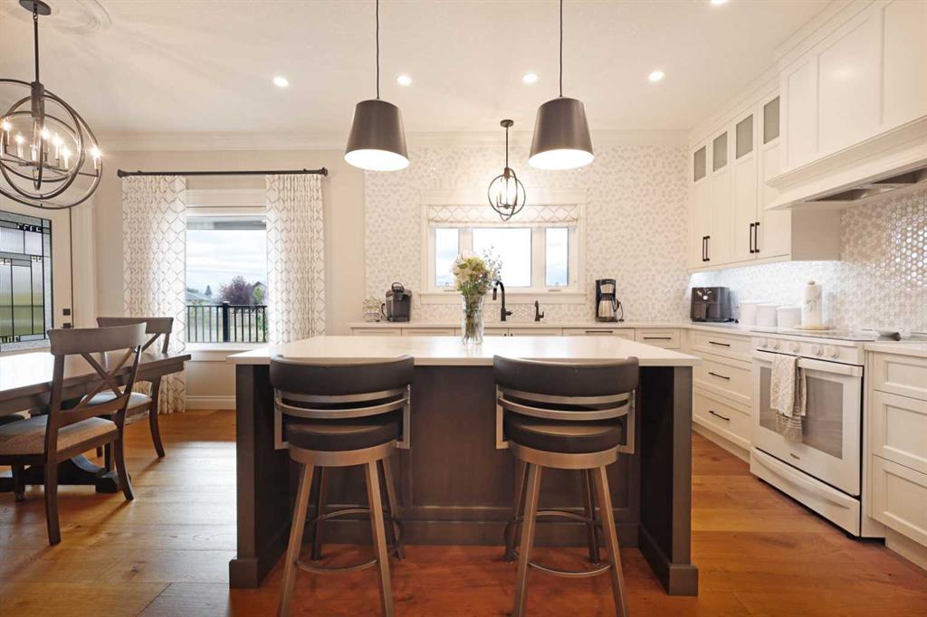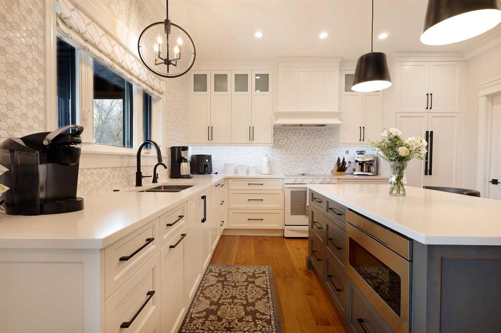 The heart of the home is the stunning chef inspired kitchen that’s crafted with both style and function in mind. Soft white high profile cabinets are beautifully contrasted with a rich wood toned island and built-in hutch. Quartz countertops, a tasteful tiled backsplash and hand picked lighting and hardware elevate the space. A generous pantry and ample cabinetry ensure you’ll never be short on storage, while the large island invites family and friends to gather around.