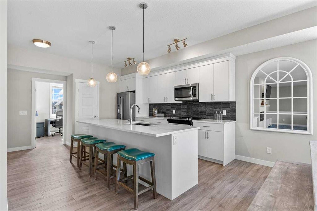 Tucked into the coveted natural enclave of Riverstone of Cranston, this rare corner end-unit offers the kind of lifestyle people move here for — Fish Creek Park, the Bow River, and miles of serene pathways literally at your doorstep. Sunlight pours through the triple-pane windows on three sides, filling every room with warmth and showcasing the home’s modern design. The main floor is an entertainer’s dream, featuring a bright living room with an electric fireplace, a spacious dining area, and a sleek, modern kitchen with quartz counters, breakfast bar seating, and clean contemporary finishes. Step outside to the oversized balcony, complete with gas and water hookups, creating a true outdoor living space overlooking the beauty of Riverstone.