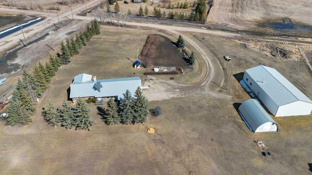 Welcome to your country retreat—where space, function, and opportunity come together on 4.83 beautifully treed acres. This sprawling 2,125 sq ft bungalow, originally built in 1970, offers the kind of layout and solid construction that acreage buyers truly appreciate. Step inside and you’ll immediately notice the warmth and character of the sunken living room, perfectly positioned off the kitchen and dining areas, and framed by stunning floor-to-ceiling windows that flood the space with natural light. The main floor is thoughtfully designed for everyday living, featuring 4 generous bedrooms plus space for dedicated office, (or spare room, storage, gym), 2.5 bathrooms, and the convenience of main floor laundry. Updated vinyl windows and a durable metal roof add peace of mind for years to come. Downstairs, the possibilities are endless—an expansive, unfinished basement (truly massive—think bowling alley size!) includes a separate walk-up entrance, making it ideal for future development, a home-based business, or even multi-generational living. Step outside through double doors off the dining area onto your east-facing deck, the perfect place to enjoy your morning coffee while overlooking your private yard filled with mature trees, established landscaping, and wide-open skies. For those needing serious workspace or storage, this property absolutely delivers: A 40’ x 80’ x 14’ heated shop with in-slab heating and two office spaces—a true showstopper for entrepreneurs, trades, or hobbyists A 35’ x 23’6” Quonset (built in 1983) with concrete floor, water hydrant, and service pit, ideal for cold storage or equipment The yard is set up for both productivity and enjoyment, featuring a large garden, established raspberry bushes, and a small greenhouse. The property is fenced on three sides (with completion planned for summer), offering added security and flexibility for animals or future plans. The West Property Line borders the CGC Wallboard Plant - they have added privacy enhancements along the south & west property lines including newly planted 6’ trees, and a sound berm. This is more than just an acreage—it’s a lifestyle property with the space, infrastructure, and potential to make your vision a reality.