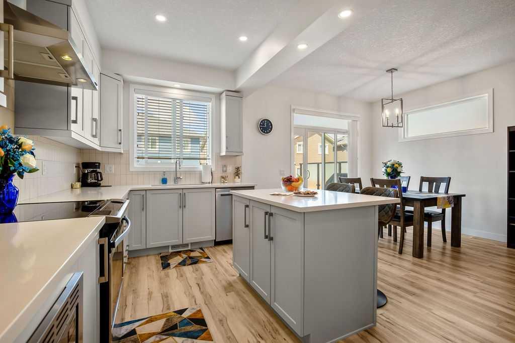 Step inside to a bright, open-concept main floor featuring durable luxury vinyl plank flooring and a spacious living area that seamlessly connects to the dining space and contemporary kitchen—perfect for both everyday living and entertaining. The kitchen is a standout with quartz countertops, a central island with flush eating bar, upgraded lighting, and a full stainless steel appliance package including a French door fridge with icemaker, glass-top stove, built-in dishwasher, designer hood fan, and built-in microwave.