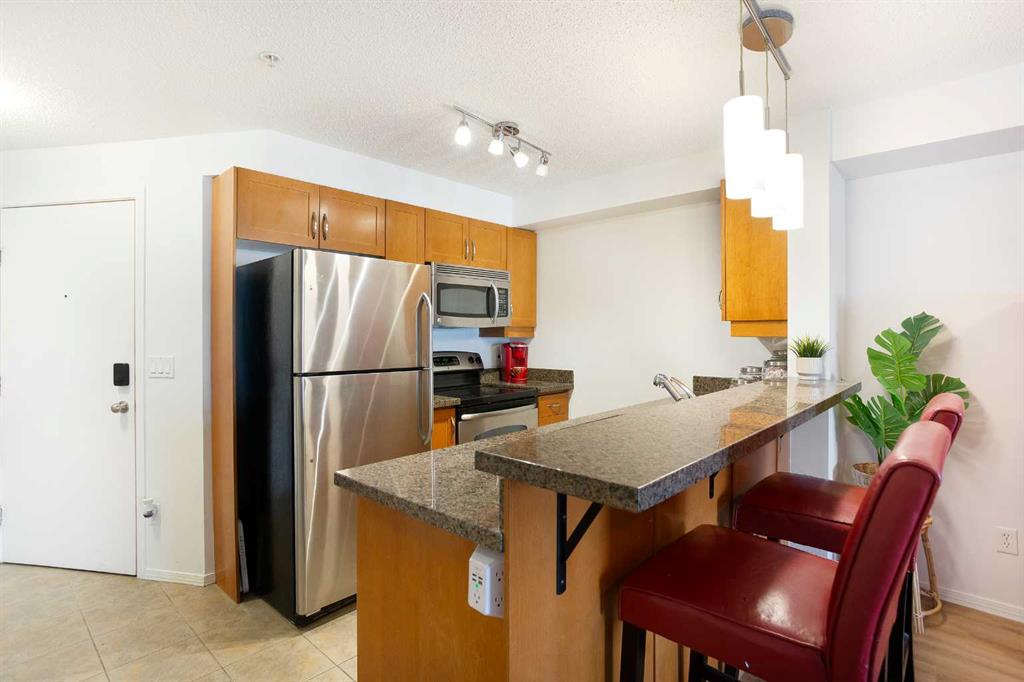 The open-concept layout offers a bright and functional living space, featuring maple kitchen cabinets, granite countertops, stainless steel appliances, and a breakfast bar. The west-facing balcony brings in great natural light and is perfect for enjoying afternoon sun.