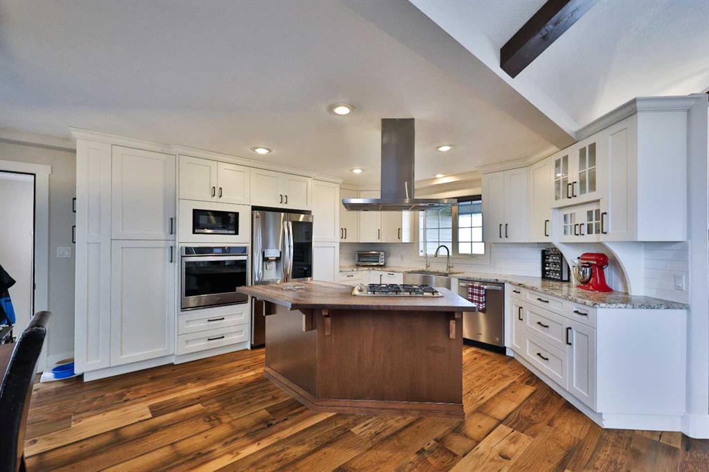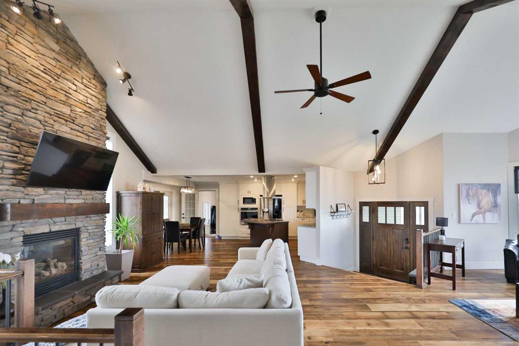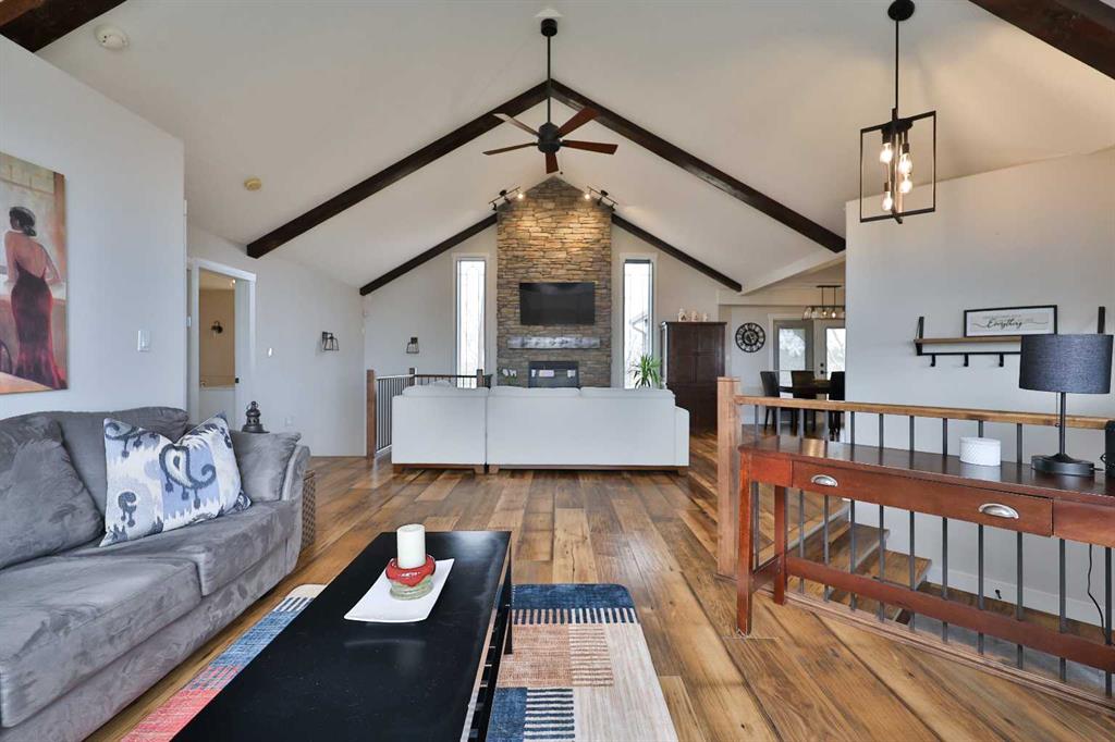 Inside, you’ll find a bright, open-concept layout featuring vaulted ceilings with wood beam accents, a stunning kitchen with granite countertops, stainless steel appliances, a large island, and a cozy wood stove that adds both warmth and character. With 4 bedrooms, 2 full bathrooms, and a fully finished basement, there’s plenty of space for families of all sizes.