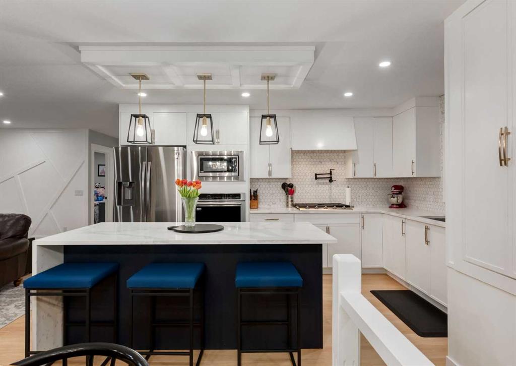 Tucked into the highly sought after community of Varsity, this beautifully renovated bungalow offers the perfect balance of style, comfort, and location just minutes from the University of Calgary, Market Mall, University District, and the Bow River pathways. This 4 bedroom, 3 bathroom home has been thoughtfully updated with quality craftsmanship and attention to detail carried throughout every room. The open concept main floor is filled with natural light from large windows, creating a bright and welcoming living space centered around a cozy fireplace. The kitchen is both functional and refined, featuring quartz countertops, a spacious waterfall island, stainless steel appliances including a gas cooktop and built in wall oven and microwave, along with ample storage. The primary bedroom offers a walk in closet and a private 4 piece ensuite with heated floors, creating a warm and comfortable retreat year round, while a second bedroom and full bathroom complete the main level. The fully developed basement is designed for both relaxation and entertaining, with a large recreation area, second fireplace, wet bar, two additional bedrooms, a full bathroom, and laundry room with sink. Outside, the home continues to impress with both front and back outdoor living spaces including a private backyard retreat featuring concrete steps, low maintenance artificial turf, and a pergola that creates the perfect setting for summer evenings or quiet mornings. An oversized double detached garage and convenient back alley access add to the functionality of the property. A truly turnkey home in one of Calgary’s most desirable communities steps from Varsity Acres School and close proximity to F.E. Osborne, St. Vincent de Paul, and Marion Carson Schools. Click on the video in the media link and book your private showing to view this exceptional opportunity!