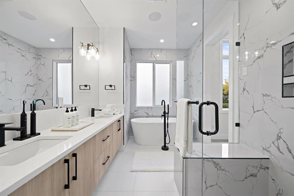 Calling all Investors! Looking for a brand new SXS Duplex with legal basement suites? This 8112 unit can be sold together with attached 8114 to provide an excellent cash flowing opportunity with the convenience of having all construction materials and components still under New Home Warranty. Both 8112 and 8114 are rented on long term leases with tenants who would prefer to stay. This unit rents monthly at $2900 for the upper suite + 70% util. and $1250 + 30% util. for the lower suite. Amazing home boasting elevated design and incredible functionality, featuring a legal 2-bedroom basement suite and a sunny south exposed front with expansive valley views from the upper floor. Every detail was thoughtfully selected, from the wide-plank modern floors to the curated lighting and premium finishes throughout. Step inside to a bright, open-concept main floor with 10\' ceilings, oversized windows and neutral tones that create an airy, inviting vibe. The large, well-lit dining room is perfect for bigger families and/or hosting guests and shows off a vibrant and colourful feature wall, which flows seamlessly into a designer kitchen featuring modern warm toned cabinetry, paired with beautifully coloured glass backsplash, quartz countertops, matte black hardware, a huge walk-in pantry with built-in shelving, and a perfect-sized center island with bar seating with more natural wood tones, bringing everything together beautifully. The upgraded stainless steel appliance package includes an oversized sub zero fridge with french doors, a gas cooktop with stylish hood fan, and a thoughtfully placed wall oven and microwave. The rear living room is wide and spacious featuring additional large windows plus a cozy gas fireplace with stone surround and custom mantle, and which leads you out to the large backyard, which features an oversized concrete pad, perfect for end of the day BBQ\'s and lounging. An enclosed mudroom with a large closet area and a sleek powder room that comes with a raised matte black sink complete the mainfloor. Upstairs contains the three large bedrooms, all with trayed ceilings, including the primary bedroom which is a true retreat that features a large walk-in closet with several custom built-ins plus a hotel like ensuite. Enjoy heated tile flooring, dual sinks, quartz countertops, matching tile surrounds, plus a free standing soaker tub and an oversized glass shower with rain shower head and roughed-in for steam. The upper laundry room comes with a sink, quartz countertops, additional wood toned cabinetry, and is situated beside the stylish full bathroom which features a tiled tub/shower combo. Downstairs features the thoughtfully designed legal 2 bedroom suite and features 9\' ceilings, luxury vinyl plank flooring, wonderfully warm toned cabinetry, stainless steel appliances and lots of pot lighting. A full bathroom with elegant tile is also featured plus a dedicated laundry room, separate side entrance and storage, making this perfect for rental income.