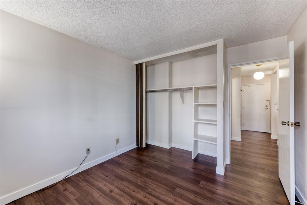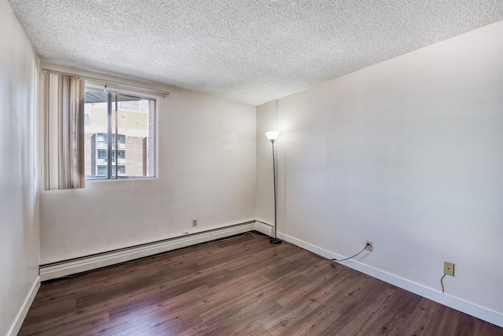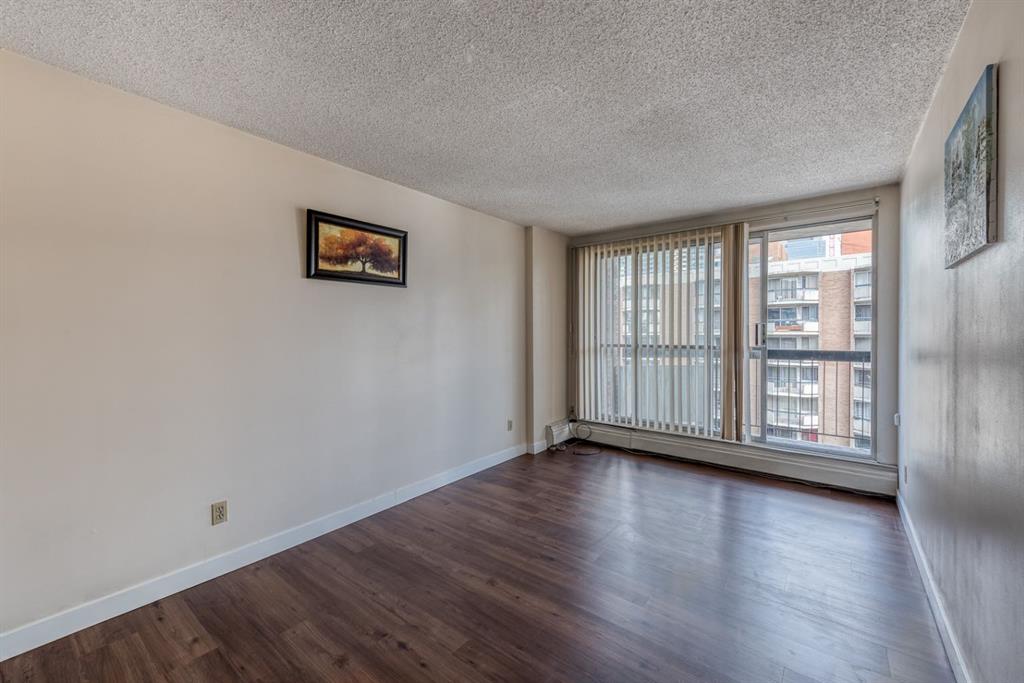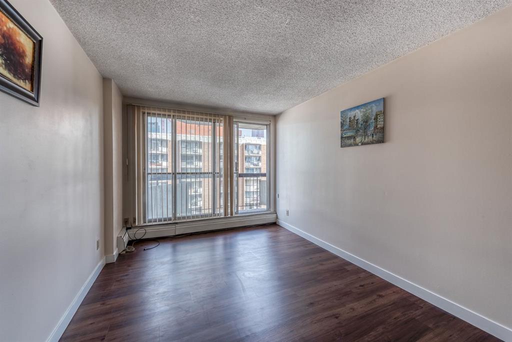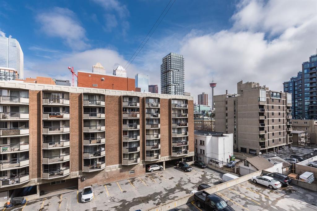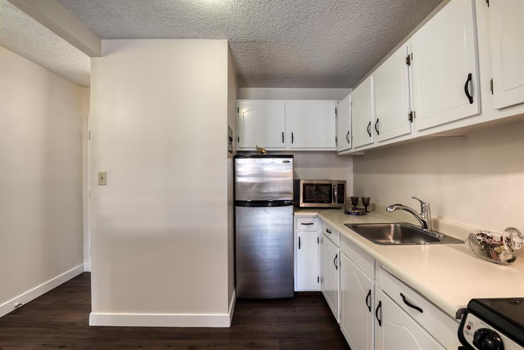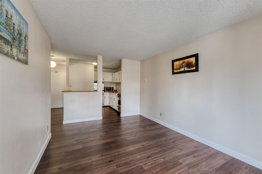 Excellent opportunity to own a one-bedroom condo in a prime inner-city location. Offering approximately 460 sq/ft of well-designed living space, this unit features a functional layout with new vinyl plank flooring and fresh paint throughout, refinished kitchen cabinets and all doors painted. The living area opens to a private balcony with downtown skyline views. The kitchen provides ample cabinetry and workspace, while the bedroom is well-proportioned with convenient access to the full bathroom. This unit is ideal for first-time buyers, investors, or those seeking a low-maintenance urban lifestyle. Condo fees include all utilities, providing ease of budgeting. The building offers a range of amenities, including an indoor swimming pool, sauna, fitness centre, bike room and a shared laundry facility. One assigned secured parking stall is included. Located within walking distance to downtown, 17th Avenue, shopping, restaurants, public transit and green spaces. Healthy reserve fund and It is priced to sell!