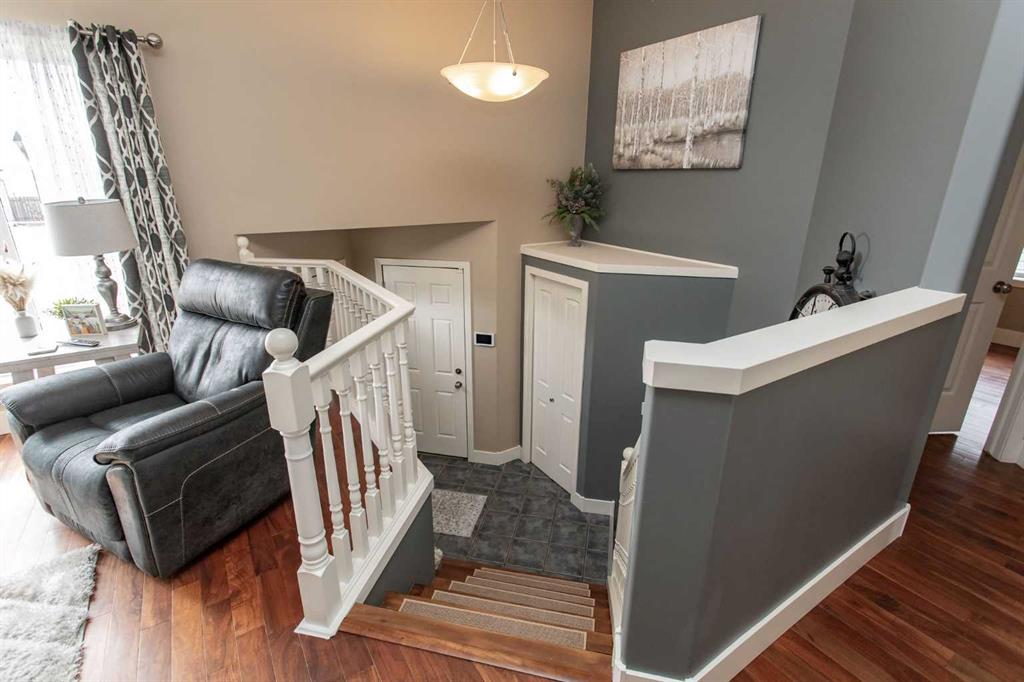 Welcome to this beautifully maintained bi-level home, perfectly situated on a desirable corner lot in Lacombe. From the moment you step inside, you’ll appreciate the thoughtful design, stylish décor, and functional layout that make this home truly stand out. The main level features an inviting open-concept design highlighted by rich walnut hardwood flooring, vaulted ceilings, and an abundance of natural light. The kitchen is both stylish and practical, offering granite countertops, ample cabinetry, generous prep space, and a convenient walk-in pantry for added storage. The adjoining living and dining areas create the perfect space for everyday living and entertaining. This level also includes two spacious bedrooms, including a primary suite designed to accommodate a king-sized bed, complete with a walk-in closet and a private 4-piece ensuite. An additional 4-piece bathroom completes the main floor. The fully finished basement offers exceptional additional living space, featuring two more bedrooms, a 3-piece bathroom, and a fantastic family/games room with a wet bar—ideal for entertaining or relaxing. Large bi-level windows allow for plenty of natural light, creating a bright and welcoming lower level. A laundry room with sink, utility room, and under-stair storage add to the home’s practicality. Step outside to enjoy the west-facing backyard, perfect for soaking up the afternoon and evening sun. The yard is fully fenced with back alley access, ample street parking, and is conveniently located near soccer fields and a neighborhood playground. Garden enthusiasts will appreciate the charming “English garden” filled with established perennials, creating a peaceful outdoor retreat. A wonderful opportunity to own a move-in-ready home in a sought-after neighborhood—this one checks all the boxes!