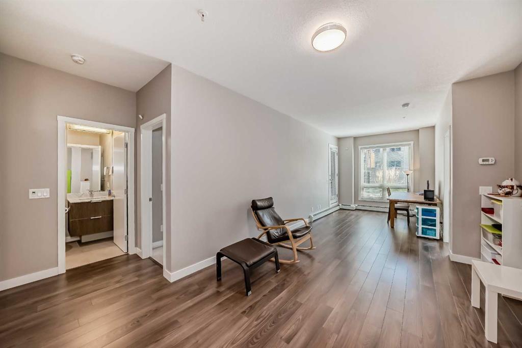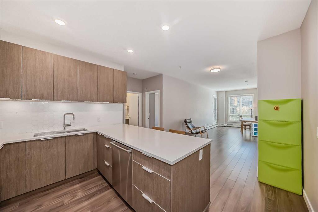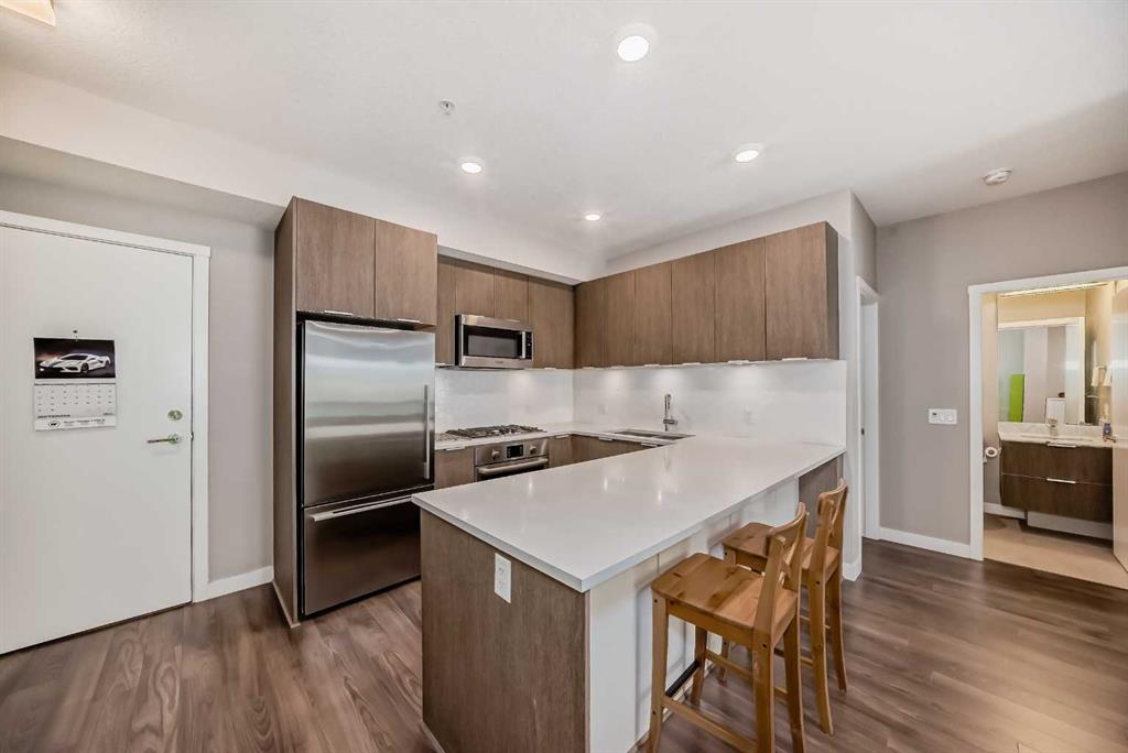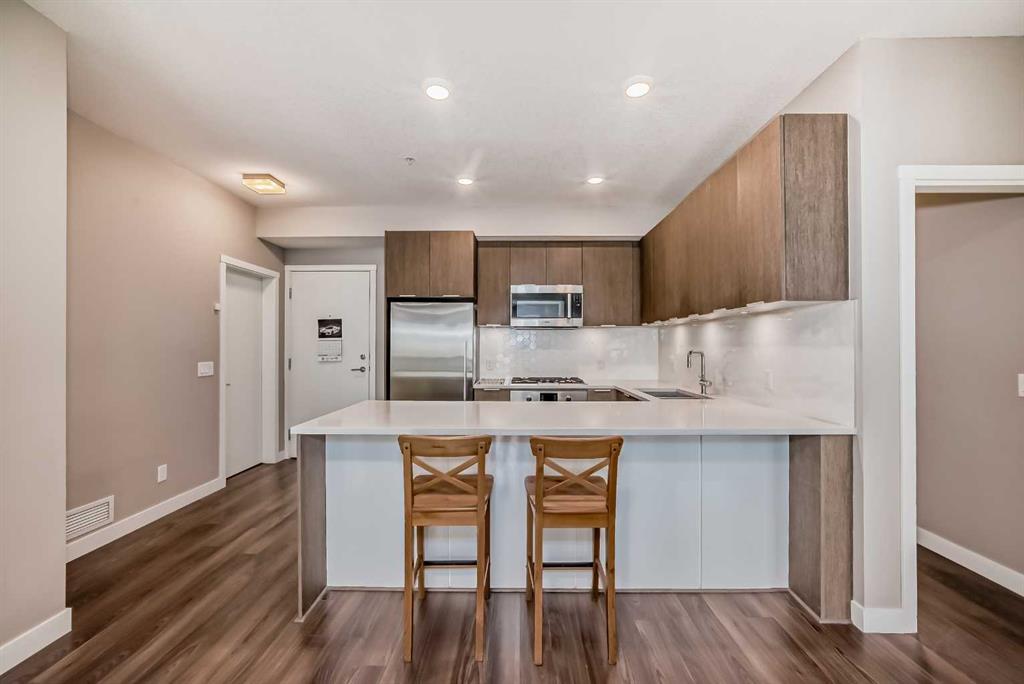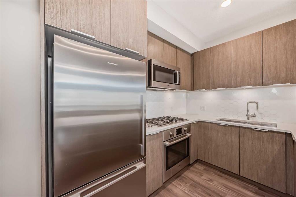 Discover urban living in the vibrant Sunnyside neighborhood with this stunning south-facing unit. Upon entering the secured building, you\'re greeted by an impressive green living wall that creates a welcoming atmosphere. This spacious 2-bedroom + den unit is on the main floor, offering modern features throughout. The kitchen boasts sleek stainless steel appliances, ample counter space, modern cabinetry, quartz countertops, a gas stovetop, and a built-in oven, all set against beautiful laminate flooring. The living room is bright and inviting, with a large window that fills the space with natural light. Near the entrance, a spacious laundry room provides additional storage. The den is perfect for a home office, ideal for remote work. The unit includes a 4-piece bath near the secondary bedroom, and the master bedroom offers a walk-through closet leading to a 3-piece ensuite with a large shower and tiled floors. A titled tandem parking stall in the heated underground garage is also included. Located within a 5-minute walk to LRT stations, Safeway, and the trendy Kensington area with its cafes and restaurants, this unit provides easy access to the Bow River pathways for walking or biking with beautiful downtown views. SAIT is just two blocks away, and the University of Calgary is a short drive. The building amenities, including a car wash, workshop, storage rooms, and secure bike storage, ensure every need is met. Don’t miss this opportunity for luxury, convenience, and a fantastic lifestyle in a highly desirable location. Call for a viewing today!
