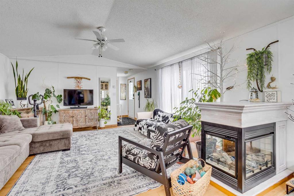 The home features a bright, open-concept kitchen designed for both functionality and style, with ample space for cooking and entertaining. The adjoining living room is warm and inviting, highlighted by a three-way fireplace that adds both comfort and visual appeal to the main living areas. Large windows throughout the home allow for an abundance of natural light, creating a bright and welcoming atmosphere.