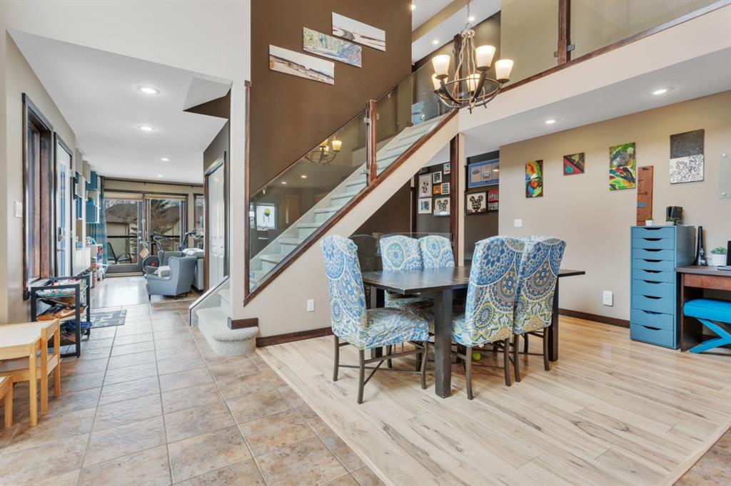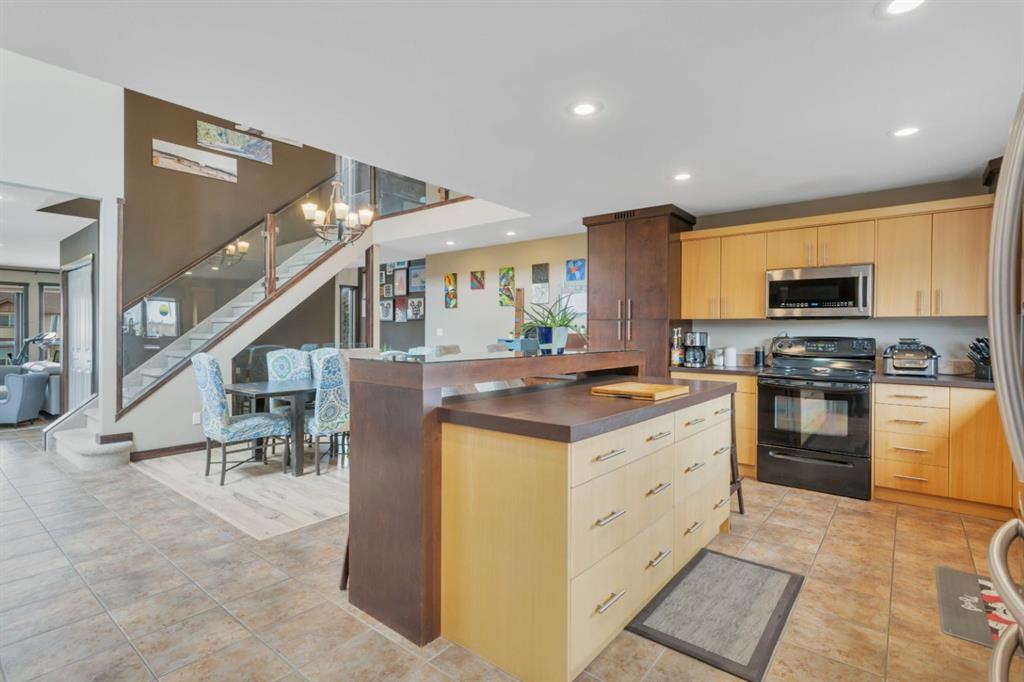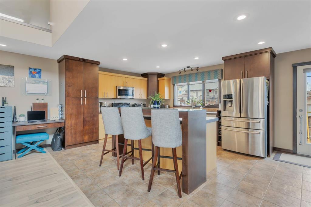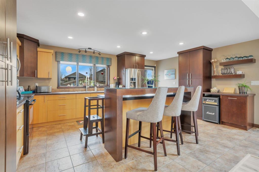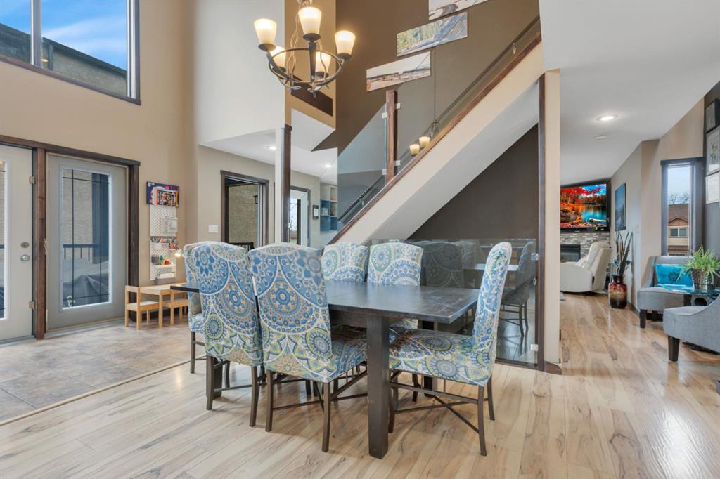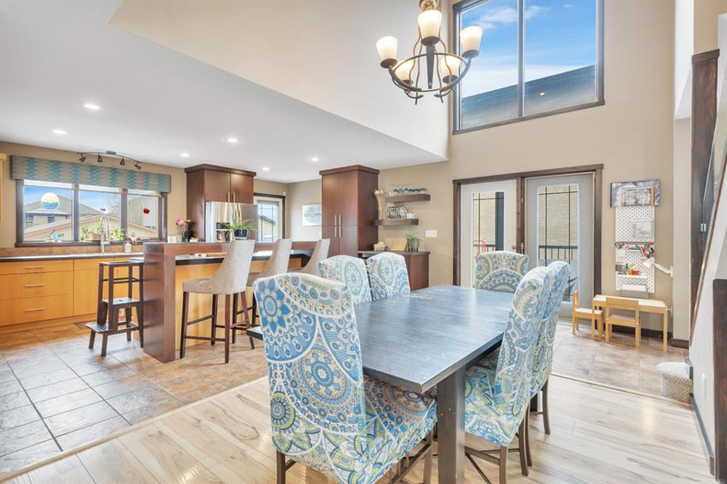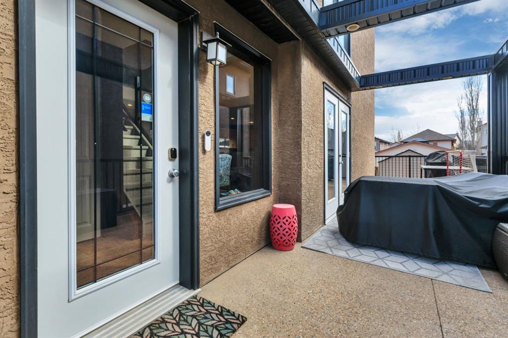 The west-facing living room is warm and welcoming, featuring a gas fireplace and access to an open balcony with views of the nearby pond, green space, and walking trails. The kitchen is very spacious and equipped with stainless steel appliances, a large island with raised eating bar, a built-in wine rack, and easy access to the fully fenced backyard— with plenty of green space for the kids to play or the dog to run. Ideal for indoor-outdoor living are patio doors off the kitchen dining out to a spacious deck, making this home the go to for summer BBQing and hosting. Or relax with the AC going on those hot Alberta days!