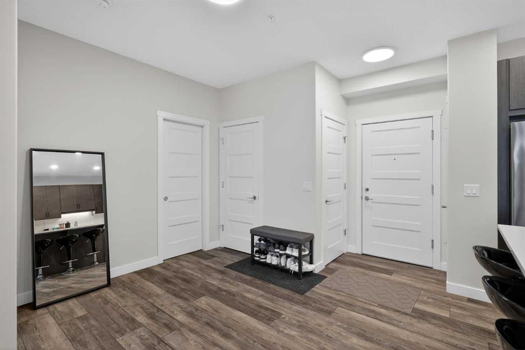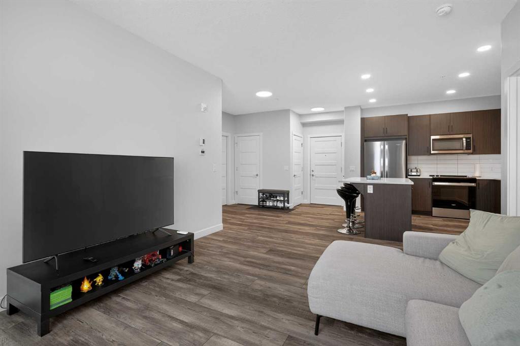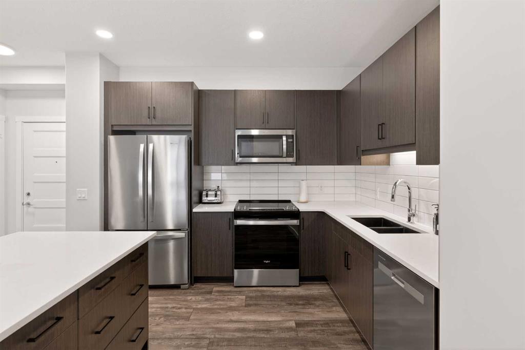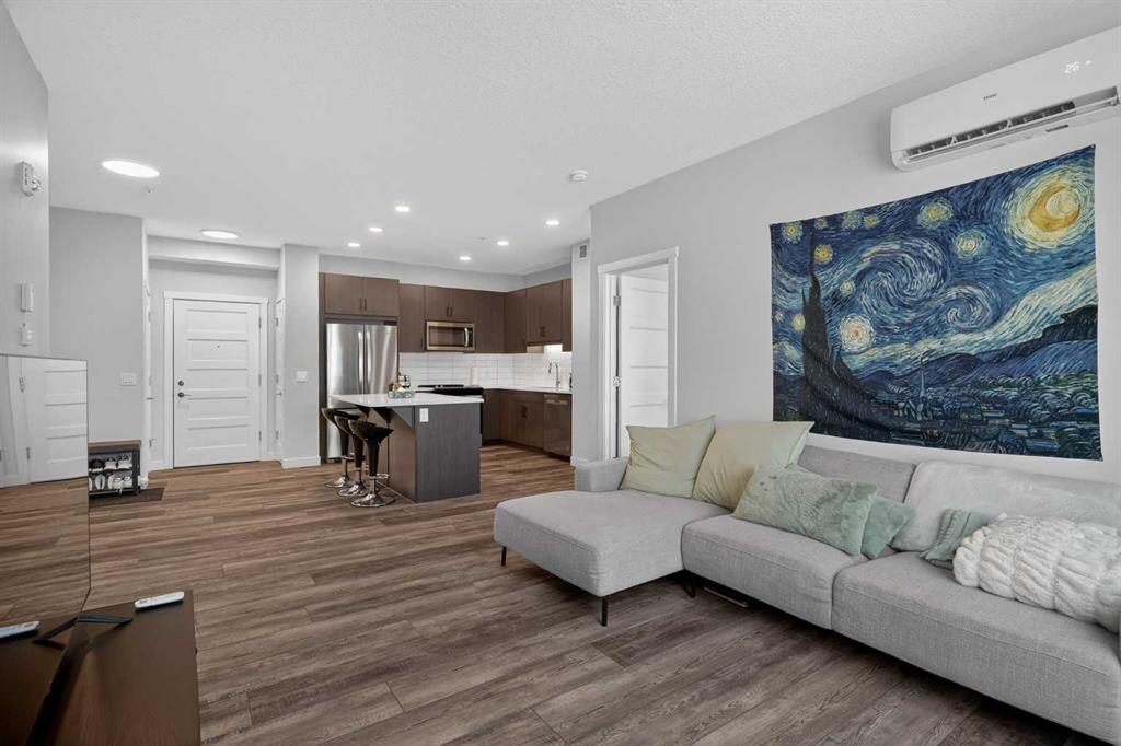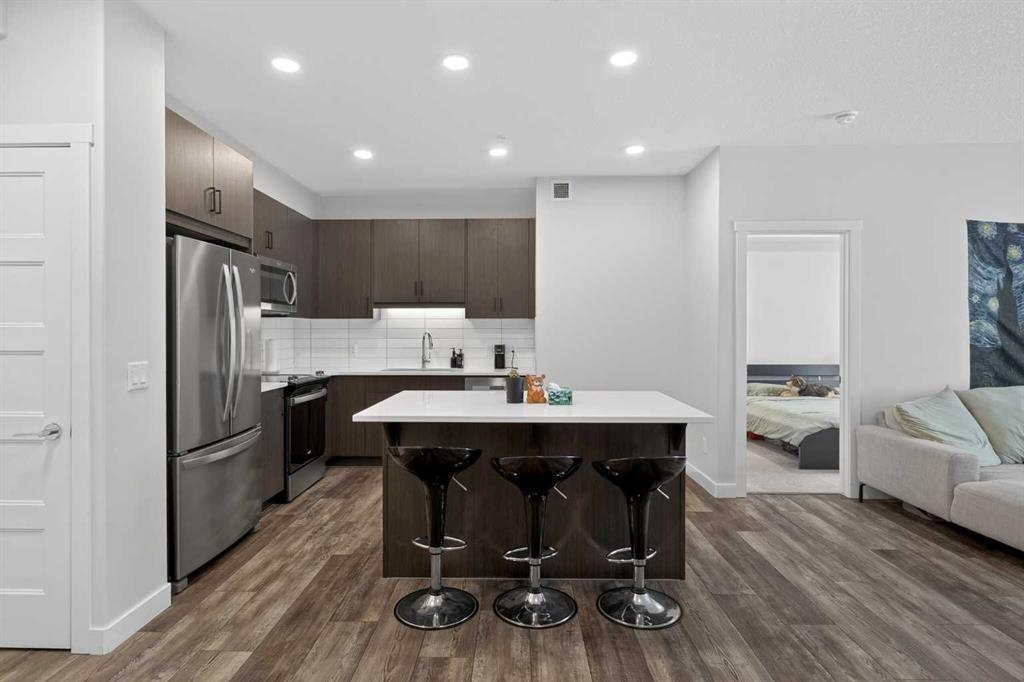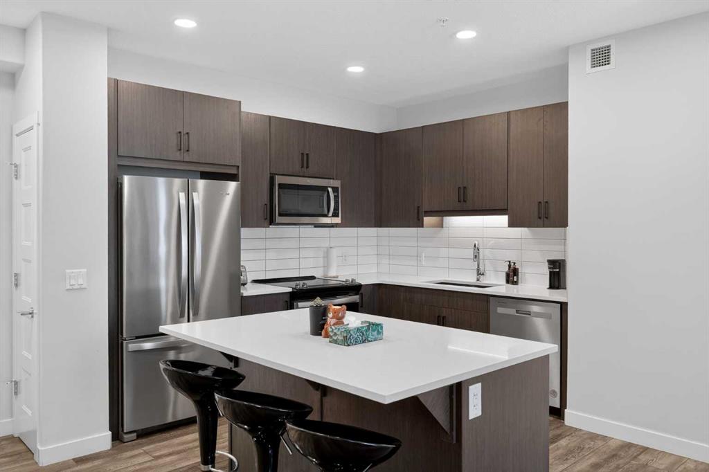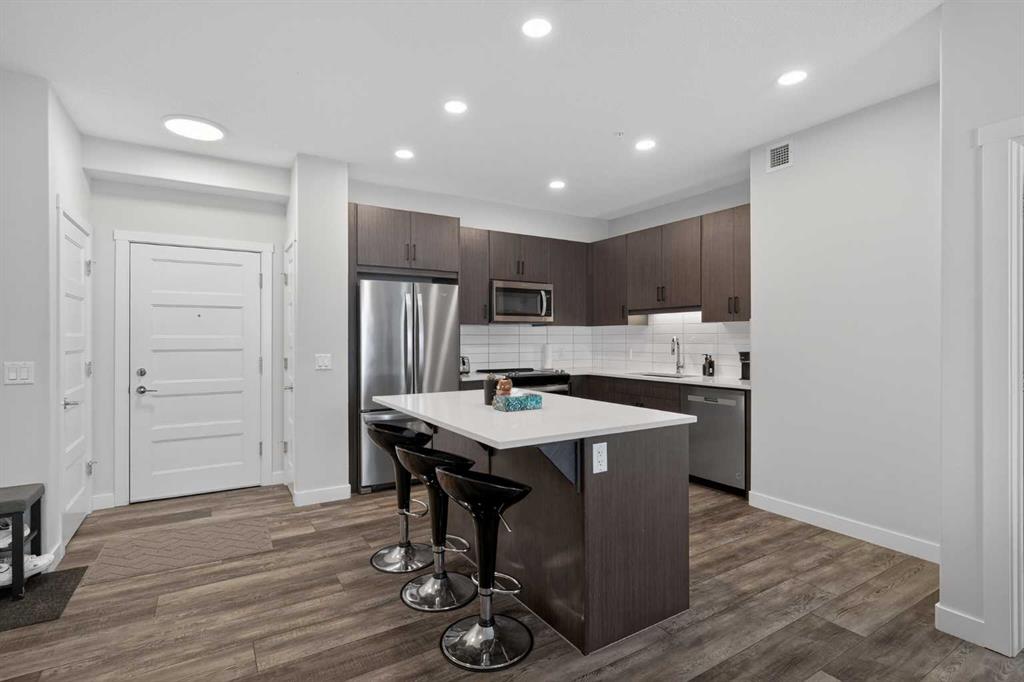 Experience elevated modern living in this exceptional third-floor condominium, perfectly situated in the vibrant new community of Wolf Willow. This home has been meticulously curated with premium upgrades, including soaring nine foot ceilings and durable luxury vinyl plank flooring, creating a sophisticated environment that seamlessly blends high-end style with everyday convenience.
