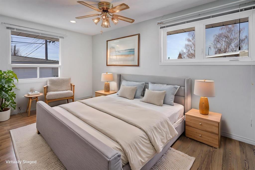 Proudly owned by the original owners since 1965, this well-cared-for bungalow offers classic charm, and incredible potential for future renovations. With its desirable layout and solid construction, this home is the perfect opportunity to personalize while enjoying a property that has been lovingly maintained over the years. The main floor features two bedrooms and two full bathrooms, along with a spacious living room, a dedicated dining area, and a functional kitchen that opens directly onto the back deck - ideal for seamless indoor-outdoor entertaining. The basement presents an excellent renovation opportunity, offering a large recreation room for family gatherings, a generously sized bedroom, a full bathroom, and a spacious utility room providing ample storage and flexibility. The heated garage adds year-round convenience, while the south-facing backyard is perfect for outdoor enjoyment. For gardeners, you will enjoy the beautifully maintained flower beds complete with a mature crabapple tree - ideal for late summer harvesting! Situated in a quiet neighbourhood with only one next door neighbour and convenient alley access, this property offers added privacy. With parking for up to 6 vehicles, there’s plenty of space for family and guests. Some upgrades to appliances include refrigerator in the kitchen (2023), furnace (2019), hot water tank (2015 only used by 2 people). The shingles on the house and garage were replaced in 2017. While the home may require some more updating, it presents a fantastic opportunity to renovate, customize, or enjoy as-is. A rare find with great bones in a peaceful setting—don’t miss your chance to make it your own!