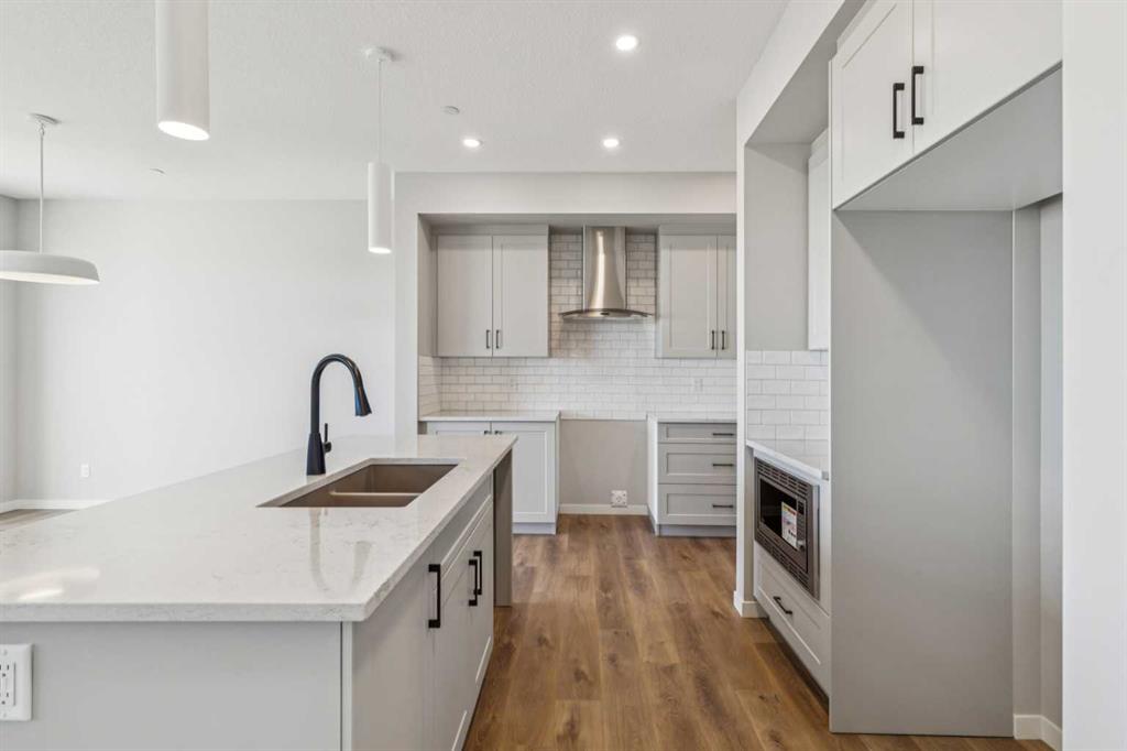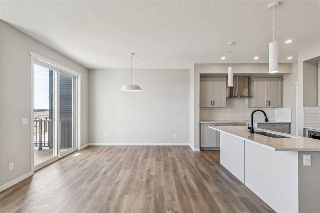 Welcome to the Carisa at 338 Hotchkiss Manor SE. Perfectly positioned on a desirable walkout lot, offering both functionality and future potential. This thoughtfully designed home delivers exceptional value with a layout tailored for modern living, all at an attainable price point. The main floor features a convenient pocket office—ideal for working from home—alongside an open-concept kitchen equipped with stainless steel appliances, a chimney hood fan, built-in microwave, quartz countertops, and an additional bank of drawers for extra storage. Luxury vinyl plank flooring flows throughout, complemented by stylish finishes like painted spindle railings and well-placed pot lights. Upstairs, enjoy the convenience of a dedicated laundry closet, a versatile entertainment room, and a spacious primary retreat complete with a dual-sink ensuite. The home also includes a 9’ foundation, secondary entrance, and a 3-piece basement rough-in—providing flexibility for future development. Step outside to a 10’ x 9’-6” walkout deck with a built-in gas line for your BBQ, perfect for entertaining or relaxing evenings. A stairwell window enhances natural light throughout the home. Combining smart design, quality finishes, and incredible potential, this is a home that truly checks all the boxes. Enjoy the added benefit of a natural wetland feature right at your doorstep, bringing serene views and a connection to nature just steps from home. Community Highlights includes, prime access to Deerfoot Trail, Stoney Trail, and Macleod Trail, Minutes from shopping, dining, and everyday amenities, Over 51 acres of parks, pathways, and wetlands for year-round recreation First-time buyers may be eligible for a GST rebate—speak to your Realtor or sales representative to learn more.