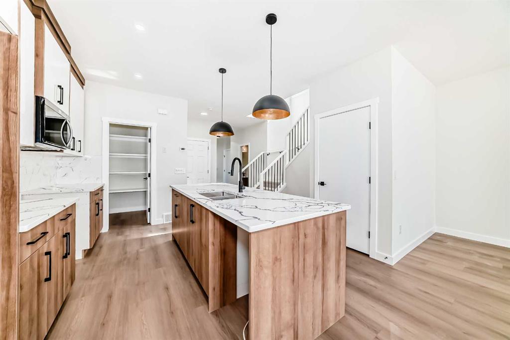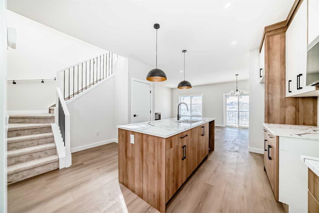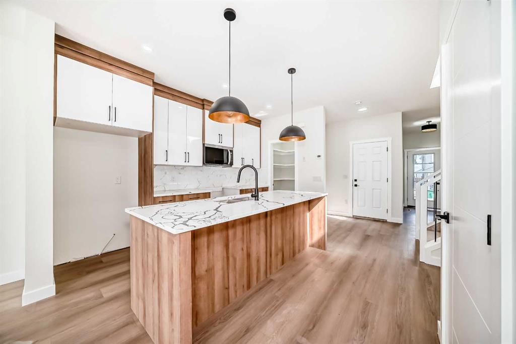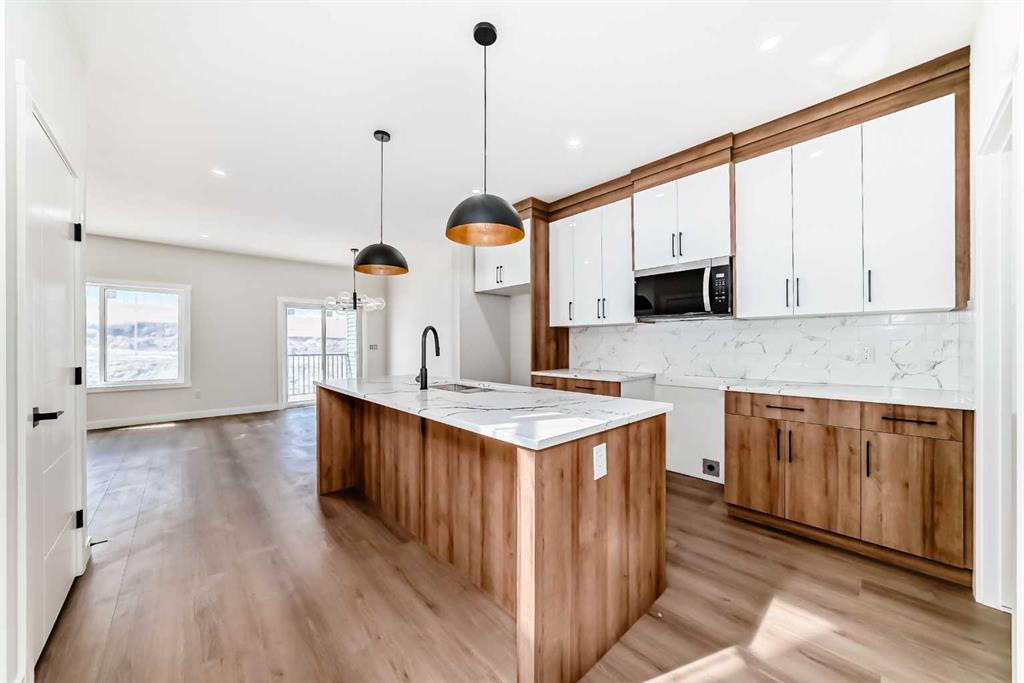 Step inside to a bright and open-concept main floor featuring large windows that fill the space with natural light. The contemporary kitchen is beautifully appointed with quartz countertops, a built-in microwave, and a spacious island — perfect for everyday living and entertaining. The kitchen flows seamlessly into the dining and living areas, creating a warm and inviting atmosphere.