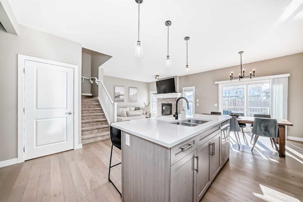 Welcome to 215 KINNIBURGH ROAD! Over 2300 sq ft of living space! Truly move-in ready, this well maintained four bedroom, 2.5 bath home offers a bright, open layout and great curb appeal with its double attached garage and inviting front entrance. Step inside to a sunlit main floor where the kitchen stands out with quartz countertops, a large island, pantry, stainless steel appliances, and modern finishes, all opening into the dining area and comfortable living room featuring a mantled gas fireplace and stone surround. Main floor laundry and a convenient two piece powder room complete this level. Upstairs, you’ll find a spacious bonus room with a vaulted ceiling, along with three good sized bedrooms. The primary suite offers plenty of space, a walk in closet, and a private ensuite with an oversized shower and soaker tub, while the additional bedrooms share a full four piece bath. The basement adds even more usable space with a large rec room, bedroom and includes a roughed-in bathroom, ready for future development. Outside, the west facing backyard is fully fenced and features a raised deck, fire pit area, plus a gas line for your BBQ. Ideally located within walking distance to East Lake School, shops, and amenities. Book your showing today!