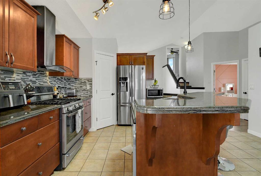 The kitchen is both elegant and functional, showcasing warm maple cabinetry, granite countertops, stainless steel appliances including a gas range, new fridge and dishwasher, a large island, pantry, tile backsplash, and tile flooring. A formal dining room provides the perfect setting for hosting family and friends, while the bright and inviting living room features vinyl plank flooring and a large window that fills the space with natural light. The private primary suite offers vinyl plank flooring, a generous walk-in closet, and a luxurious ensuite complete with a jetted tub, dual vanity with a dedicated makeup station, and a separate shower. A second bedroom and full bathroom complete the main level. The fully finished basement expands the living space with a cozy family room featuring a gas fireplace, vinyl plank flooring throughout, a third bedroom, full bathroom, and a laundry room with new washer/dryer with ample storage. Additional highlights include a fully finished and heated 24’ x 24’ garage, ideal as a workshop or retreat space. The backyard is fully fenced and designed for outdoor enjoyment, with two natural gas lines for added convenience.