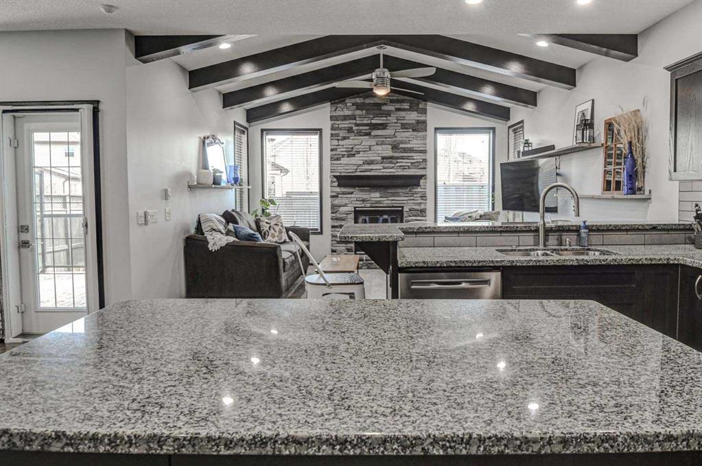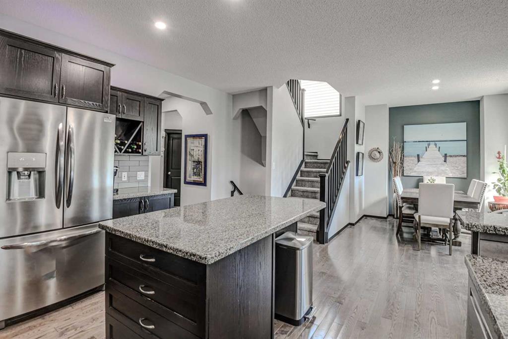 Welcome to 23 Cranberry Circle S.E.—a beautifully appointed and fully developed 2-storey home offering over 3,000 sq. ft. of thoughtfully designed living space in the highly sought-after community of Cranston. This impressive 4-bedroom home is loaded with upgrades and perfectly suited for both everyday living and entertaining. The main floor features a bright, open-concept layout with 9-foot ceilings, rich 3/4\" ash hardwood flooring, and solid oak doors. A spacious front office overlooks the streetscape, while the inviting living room showcases vaulted ceilings with wood beams, a stunning floor-to-ceiling stone gas fireplace with log mantle, built-in shelving. The kitchen is sure to impress with quality granite countertops, extended-height oak cabinetry, abundant drawers, a centre island with storage, corner pantry, stainless steel appliances, and ambient cabinet lighting. The adjoining dining nook opens to a sunny south-facing rear deck—perfect for summer entertaining. Upstairs, you’ll find three generously sized bedrooms, including a luxurious primary retreat complete with vaulted ceiling, walk-in closet, built-ins, window bench seating, and a spa-inspired 4-piece ensuite featuring a large soaker tub, and a separate tiled shower. The two additional bedrooms each offer walk-in closets and share a convenient Jack-and-Jill bathroom with private sink areas. The fully developed basement continues to impress with 9-foot ceilings, a large recreation space anchored by a second stone gas fireplace, wet bar, flex room or 4th bedroom, and a stylish 3-piece bathroom with heated floors. Additional highlights include a heated, oversized double attached garage with an 8’ door and ceiling height suitable for car lifts, main floor laundry and mudroom, a newer high-efficiency furnace, central air conditioning and ample built-in storage throughout. Outside, enjoy a low-maintenance yard with extensive decking, a retractable awning, two storage sheds, and paved rear lane access with space for RV or trailer parking—or keep the existing sea-can for added storage. Hot and cold running water in both the back yard and garage! Ideally located within walking distance to Cranston’s many amenities including most levels of schooling, the community centre, Calgary South Health Campus and more, this home offers exceptional value in a family-friendly neighbourhood. A true turnkey property with space, style, and function—this one is a must-see!