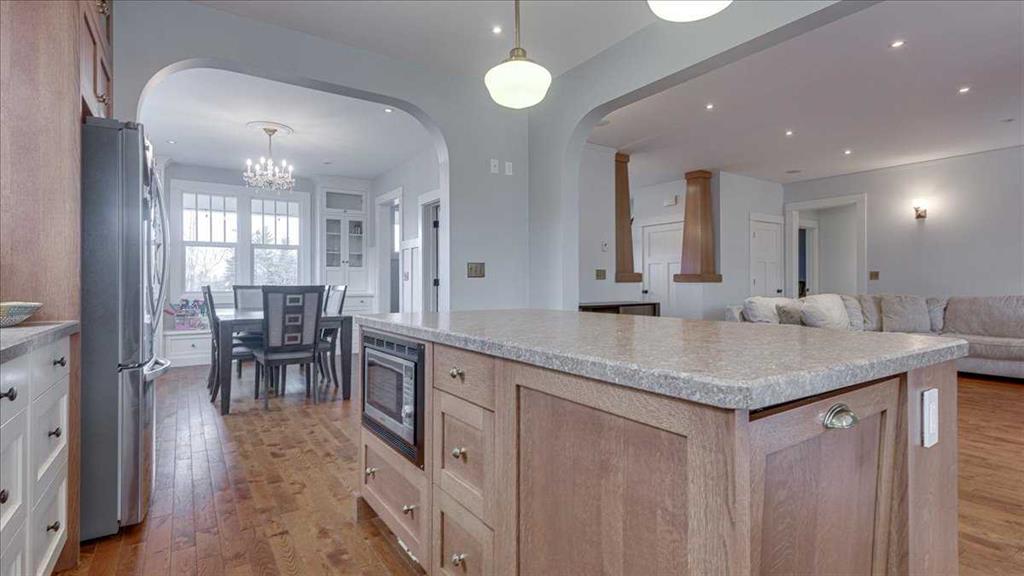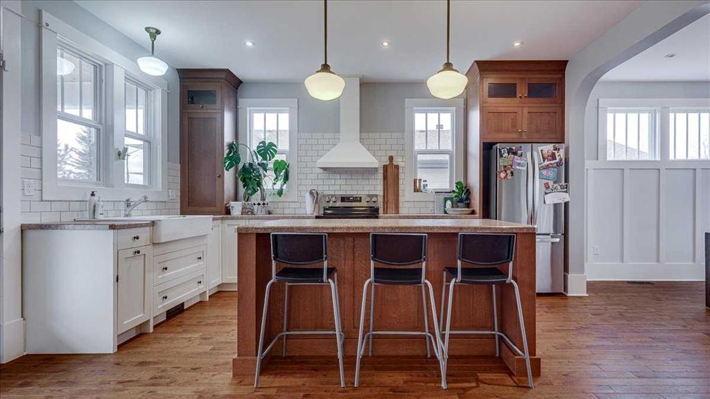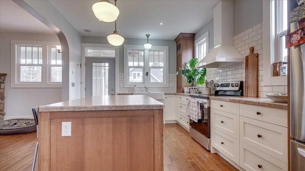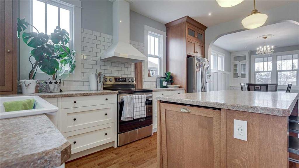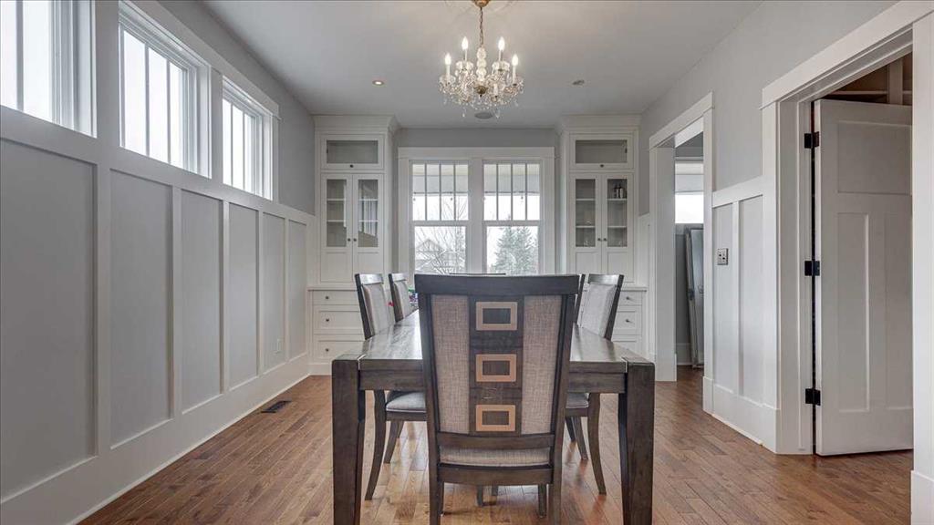 The kitchen is designed for both everyday living and entertaining, featuring a large central island, custom cabinetry, subway tile backsplash, farmhouse sink, and stainless steel appliances. It flows seamlessly into the dining area with built-in cabinetry and excellent natural light, creating a warm and functional gathering space.