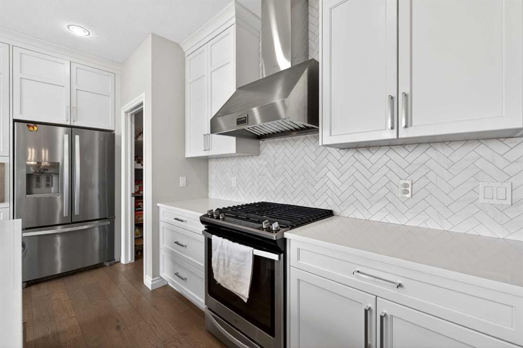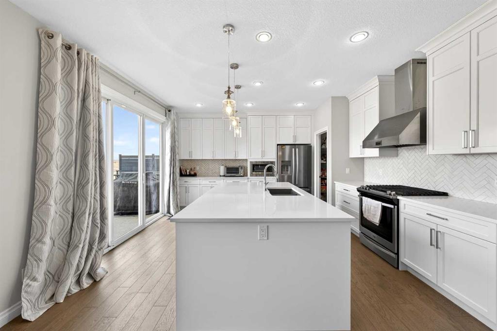 Step inside and greeted by the 9-foot ceilings and Engineered Hardwood floor. A versatile Den is ideal for a home office or study. The heart of the home is the open-concept Living and Dining area, where large windows frame the stunning panoramic views and a cozy gas fireplace adds warmth and comfort. The adjacent gourmet Kitchen features a massive quartz centre island, perfect for meal preparation, along with stainless steel appliances including a gas stove and a upgraded 600 cfm hoodfan, backsplash tile, and walk-thru pantry. Step out onto the deck with BBQ gas hookup—perfect for summer gatherings while enjoying the peaceful scenery.