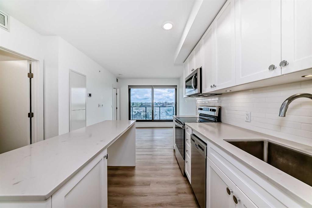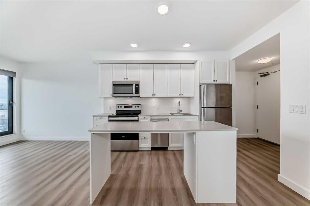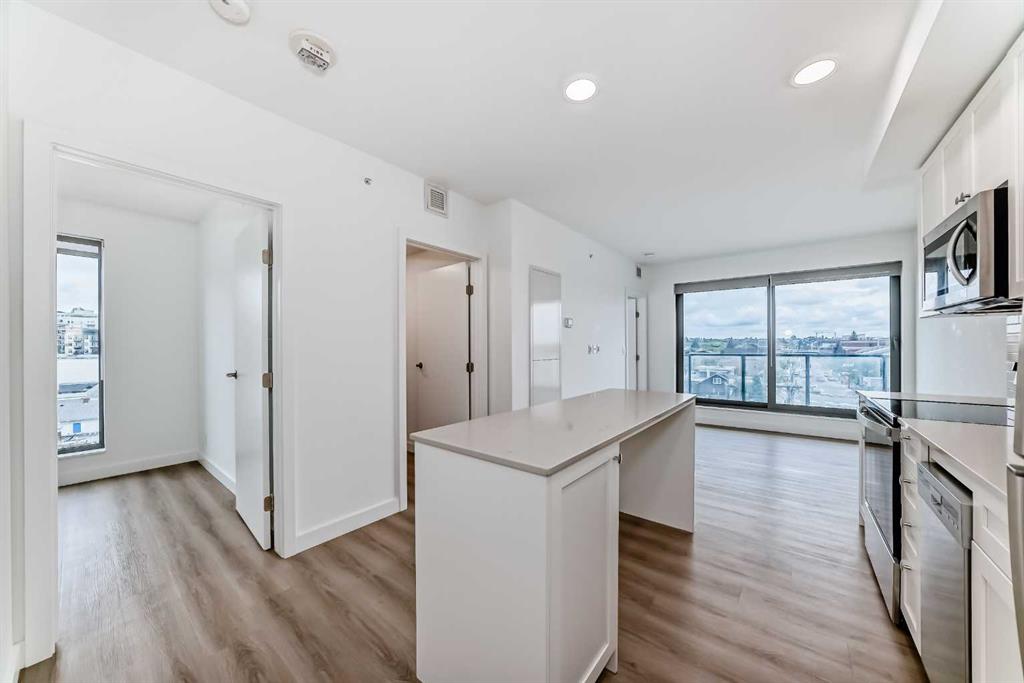 CORNER UNIT 12TH FLOOR. GREAT VIEW! Welcome to Era by Minto Communities—modern, elevated living in this well-designed 2 bedroom, 1 bathroom unit in the heart of Bridgeland. Perched on the 12th floor, this home offers unobstructed views and abundant natural light, all within one of Calgary’s most walkable neighborhoods (Walk Score of 98). You’re just steps from Bridgeland Market, Shiki Menya, Luke’s, local cafés, parks, playgrounds, and the Bow River pathway system. The Bridgeland/Memorial LRT station is nearby for quick access to downtown and the East Village. Inside, the open-concept layout seamlessly connects the kitchen and living area to a private balcony—perfect for morning coffee or evening relaxation with a view. The kitchen features a large eat-in island, quartz countertops, stainless steel appliances, and full-height cabinetry. Durable vinyl plank flooring, air conditioning, in-suite laundry, a titled underground parking stall, and a titled storage locker add everyday comfort and convenience. Built to LEED Gold standards, Era emphasizes energy efficiency and smart living, offering features like video entry, facial recognition access, secure package lockers, community messaging, and virtual concierge services. Residents also enjoy a rooftop patio with firepits and BBQs, offering stunning downtown views, along with an indoor lounge and workspace for year-round use. This well-appointed unit in a professionally managed building is an excellent opportunity to own in one of Calgary’s most desirable inner-city communities. Book your showing today. Photos are from a similar unit with an identical floorplan and may not reflect the exact finishes or views of Unit 1202. Some photos are virtually staged.