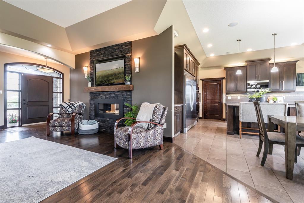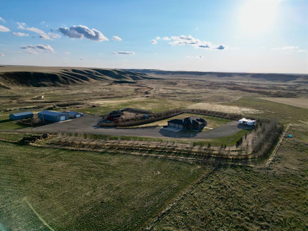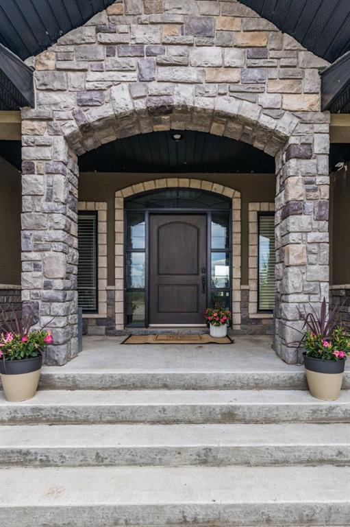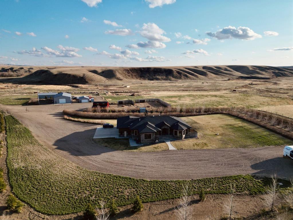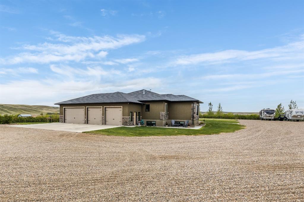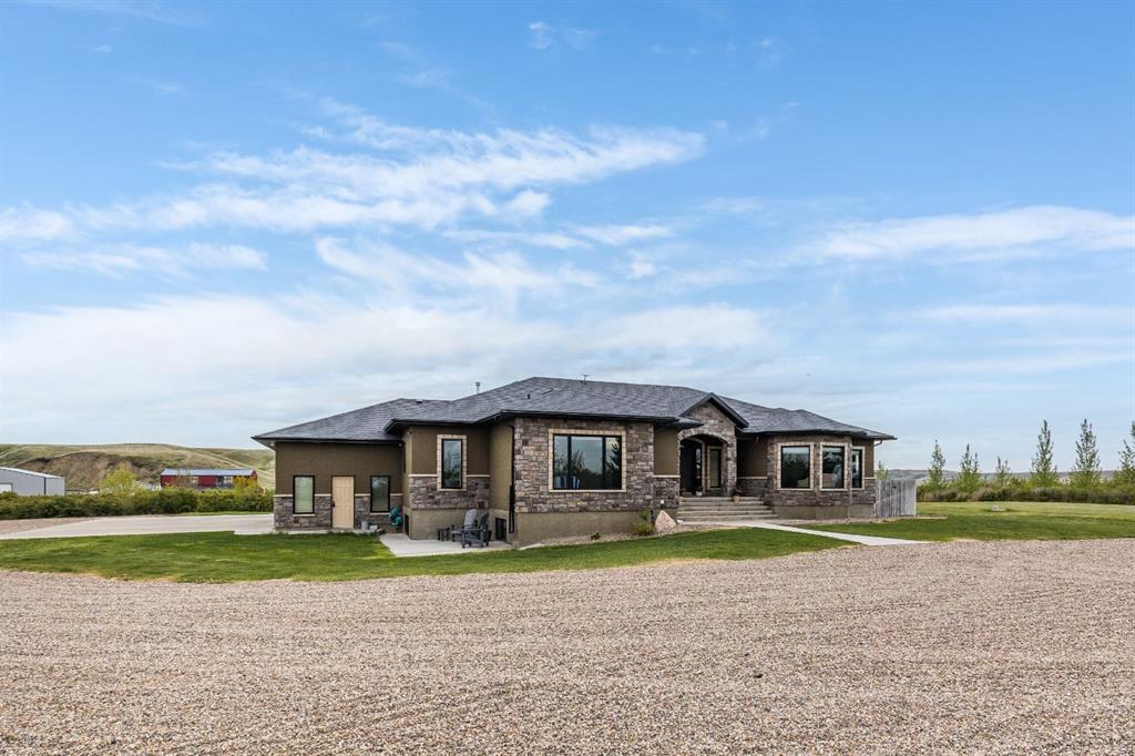 Refined Living. Expansive Land. Unmatched Opportunity. Welcome to an exceptional, meticulously maintained acreage just minutes from the city, offering a rare combination of luxury living, functional infrastructure, and breathtaking views. This impressive 2,522 sqft walkout bungalow is thoughtfully designed with 5 bedrooms, an office, den, and 4 full bathrooms, delivering both comfort and versatility. From the moment you arrive, the pride of ownership is evident. Step inside to a bright, open-concept main floor featuring 9 ft ceilings, tray ceiling detail, rich hardwood flooring, and expansive windows that frame the stunning landscape. A striking double-sided stone fireplace anchors the living space and connects seamlessly to the private office, complete with French doors, built-in desk, shelving, and cabinetry. The chef-inspired kitchen is truly a showpiece, offering a double oven, oversized fridge/freezer, prep island, and abundant cabinetry, all flowing effortlessly into the dining area where oversized windows showcase incredible views. Step out onto the covered deck with gas BBQ hookup—an ideal setting for summer dining and entertaining. Designed for everyday ease, the spacious laundry and mudroom includes a sink, ample counter space, and direct access to the walk-through pantry and attached quad garage. The primary suite is a true retreat, featuring generous space for a sitting area, a spa-like 4 pc ensuite, and a large walk-in closet. An additional bedroom and full bathroom complete the main level. The walkout basement is equally impressive, offering a massive recreation room with wet bar, direct access to the covered patio and hot tub area, a large den perfect for a home gym or media space, 2 additional bedrooms, 2 full bathrooms, and substantial storage. Set on 4.1 acres and zoned Country Residential, this property is fully equipped for a range of rural lifestyles and business opportunities. The land includes all fencing, corrals, and a stock waterer. Outbuildings are a standout feature, including an 80’x40’ insulated shop with two overhead doors and a 2 pc bathroom, a 50’x30’ insulated shop, and a 21’x26’ shop—providing exceptional flexibility for work or storage needs. This is a rare opportunity to own a turn-key acreage that seamlessly blends upscale living with the freedom and functionality of country life, just a short drive from city amenities. This property must be sold with attached 74.7 acre Agricultural land; MLS A2303885. Asking price includes both properties.