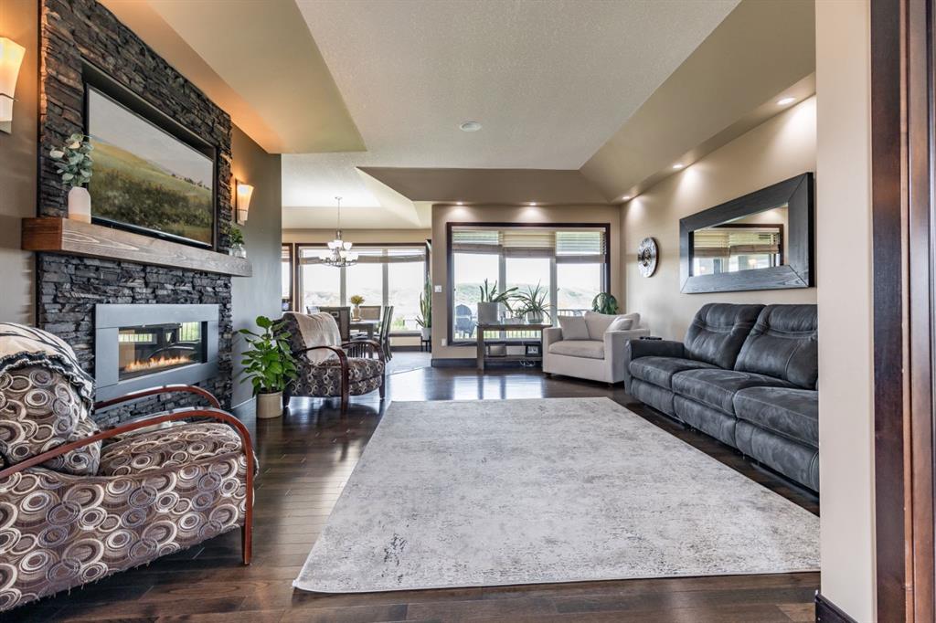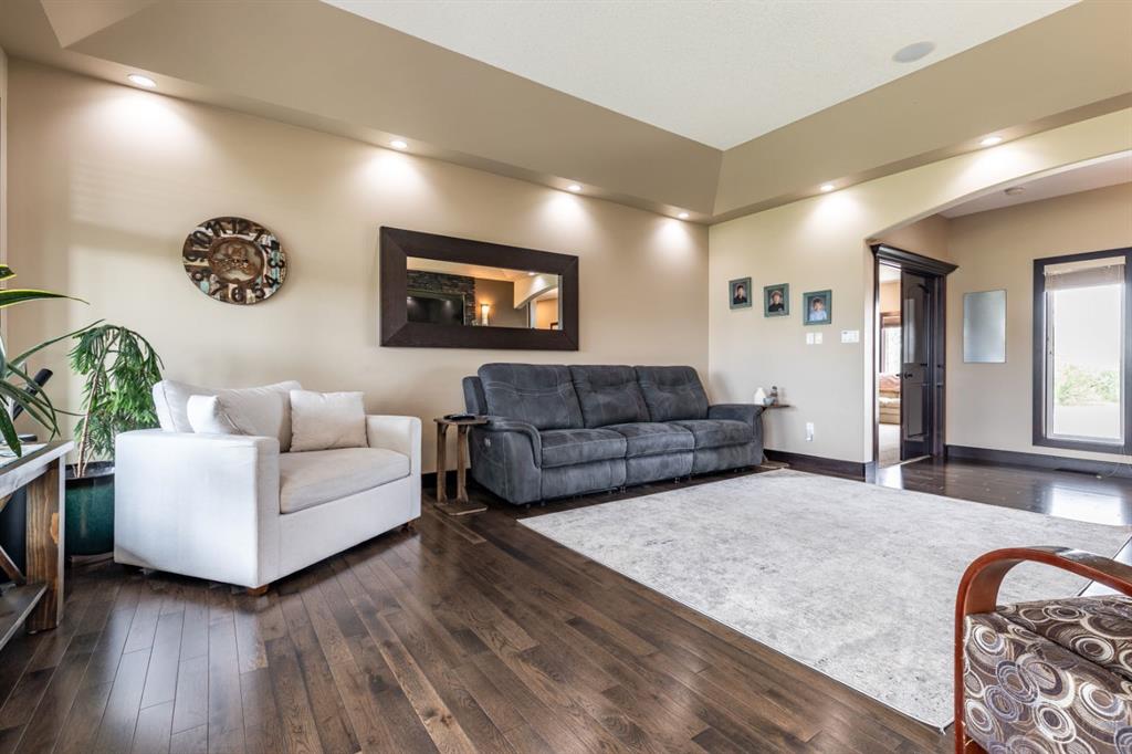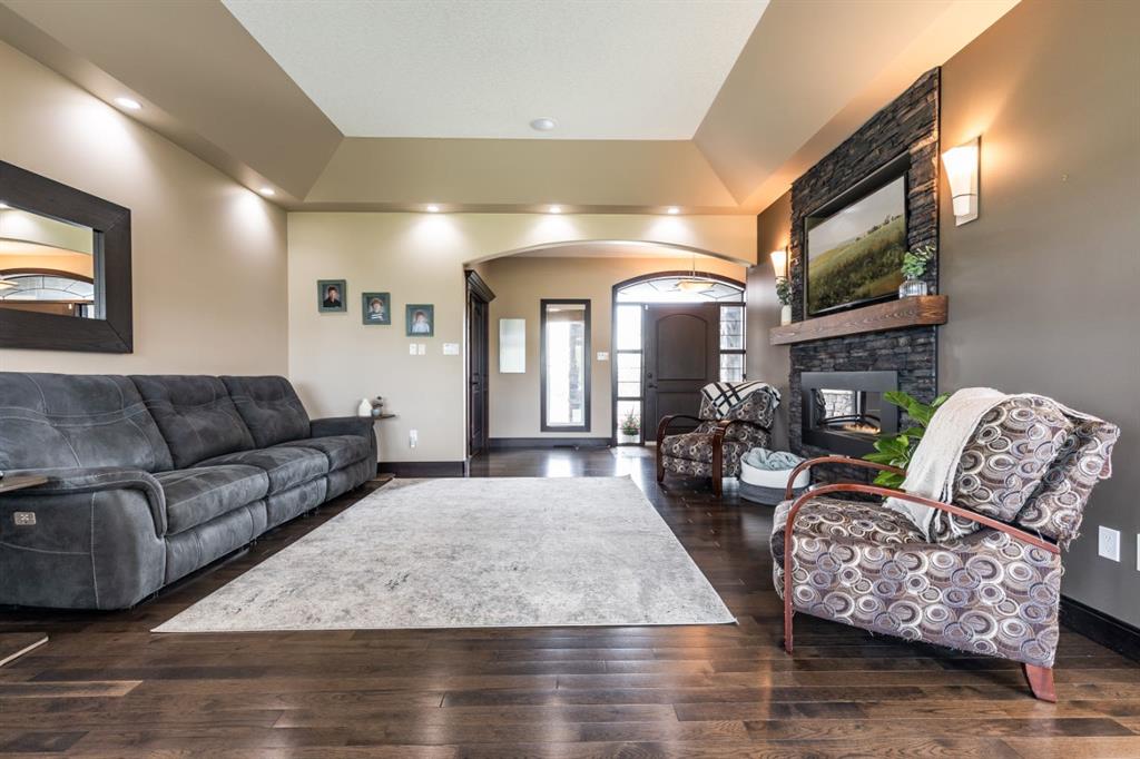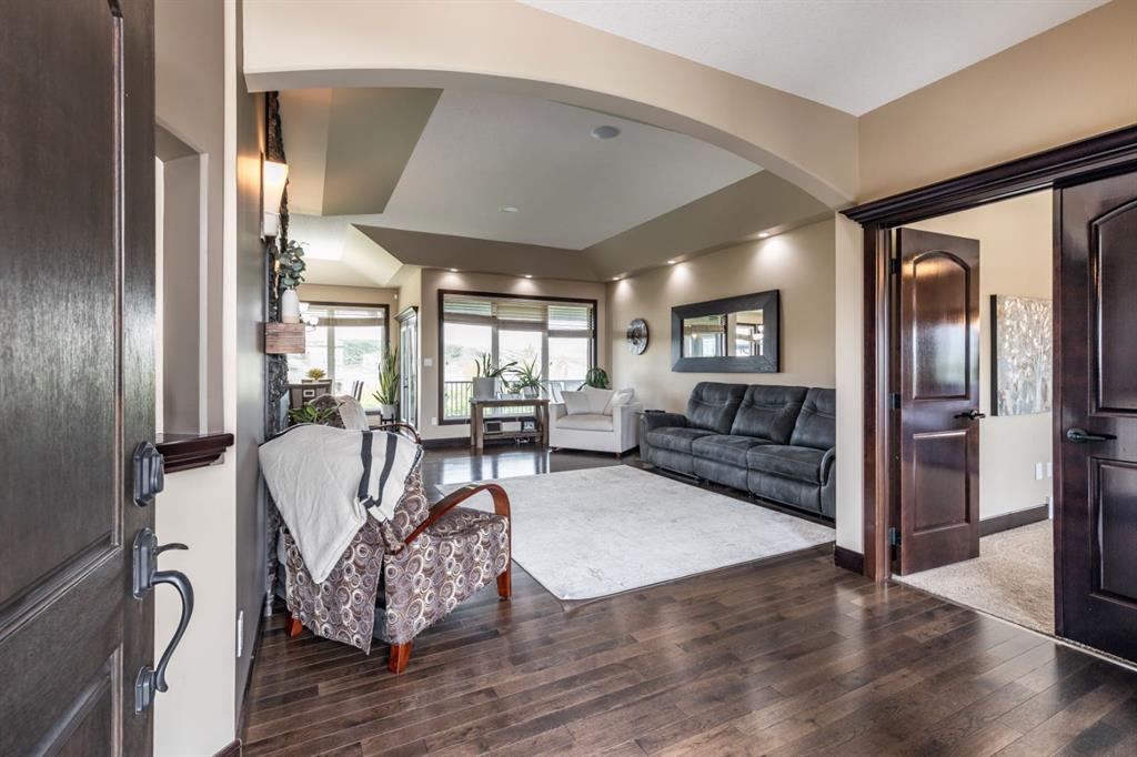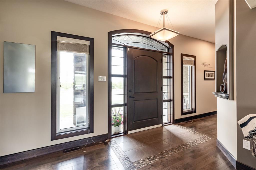 Refined Living. Expansive Land. Unmatched Opportunity. Welcome to an exceptional, meticulously maintained acreage just minutes from the city, offering a rare combination of luxury living, functional infrastructure, and breathtaking views. This impressive 2,522 sqft walkout bungalow is thoughtfully designed with 5 bedrooms, an office, den, and 4 full bathrooms, delivering both comfort and versatility. From the moment you arrive, the pride of ownership is evident. Step inside to a bright, open-concept main floor featuring 9 ft ceilings, tray ceiling detail, rich hardwood flooring, and expansive windows that frame the stunning landscape. A striking double-sided stone fireplace anchors the living space and connects seamlessly to the private office, complete with French doors, built-in desk, shelving, and cabinetry. The chef-inspired kitchen is truly a showpiece, offering a double oven, oversized fridge/freezer, prep island, and abundant cabinetry, all flowing effortlessly into the dining area where oversized windows showcase incredible views. Step out onto the covered deck with gas BBQ hookup—an ideal setting for summer dining and entertaining. Designed for everyday ease, the spacious laundry and mudroom includes a sink, ample counter space, and direct access to the walk-through pantry and attached quad garage. The primary suite is a true retreat, featuring generous space for a sitting area, a spa-like 4 pc ensuite, and a large walk-in closet. An additional bedroom and full bathroom complete the main level. The walkout basement is equally impressive, offering a massive recreation room with wet bar, direct access to the covered patio and hot tub area, a large den perfect for a home gym or media space, 2 additional bedrooms, 2 full bathrooms, and substantial storage. Set on 4.1 acres and zoned Country Residential, this property is fully equipped for a range of rural lifestyles and business opportunities. The land includes all fencing, corrals, and a stock waterer. Outbuildings are a standout feature, including an 80’x40’ insulated shop with two overhead doors and a 2 pc bathroom, a 50’x30’ insulated shop, and a 21’x26’ shop—providing exceptional flexibility for work or storage needs. This is a rare opportunity to own a turn-key acreage that seamlessly blends upscale living with the freedom and functionality of country life, just a short drive from city amenities. This property must be sold with attached 74.7 acre Agricultural land; MLS A2303885. Asking price includes both properties.