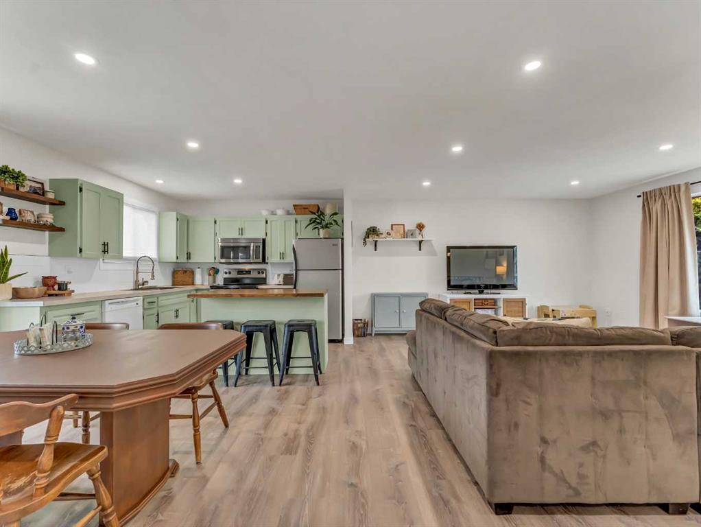The main level showcases a bright and inviting open-concept design that is perfect for both everyday living and entertaining. The stunning updated kitchen features new appliances, lots of cabinetry, attractive finishes, and a functional island that provides extra prep space and seating. The adjoining dining area flows seamlessly into the spacious living room, where a large front window fills the space with natural light and creates a warm, welcoming atmosphere.