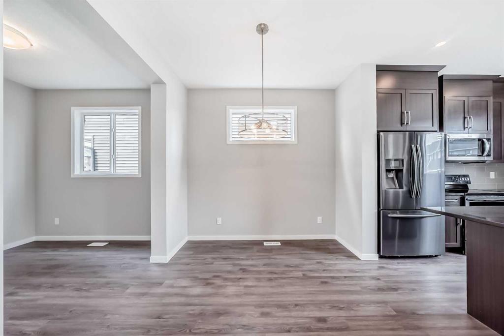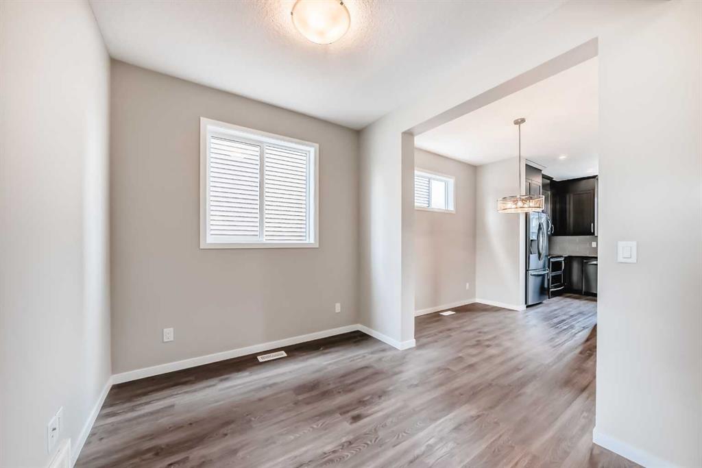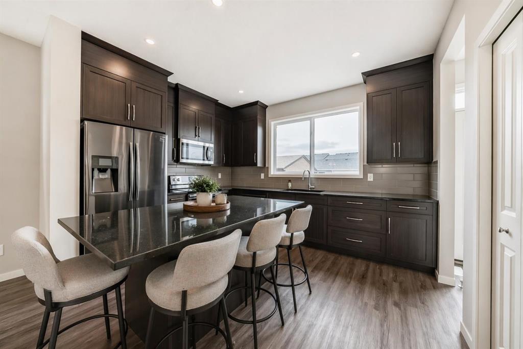 Step into the welcoming living room with a large window to take advantage of the sunny south exposure. Just off the main entry a home office/den/flex room offers a quiet space for work or study or perhaps a play room. Moving through the main level, the layout flows into the central dining area, positioned perfectly between the flex room and kitchen, great for everyday use and entertaining. The kitchen offers a practical layout with a large island with room for 4 stools, ample cabinetry, and workspace. The stainless steel appliance package includes fridge with water dispenser, OTR microwave, double door oven and dishwasher. The mudroom with closet and bench provides a functional transition space with direct access outside to the deck. Plenty of room in the backyard for your future double garage. Air conditioning unit is tucked away along the side of the house.