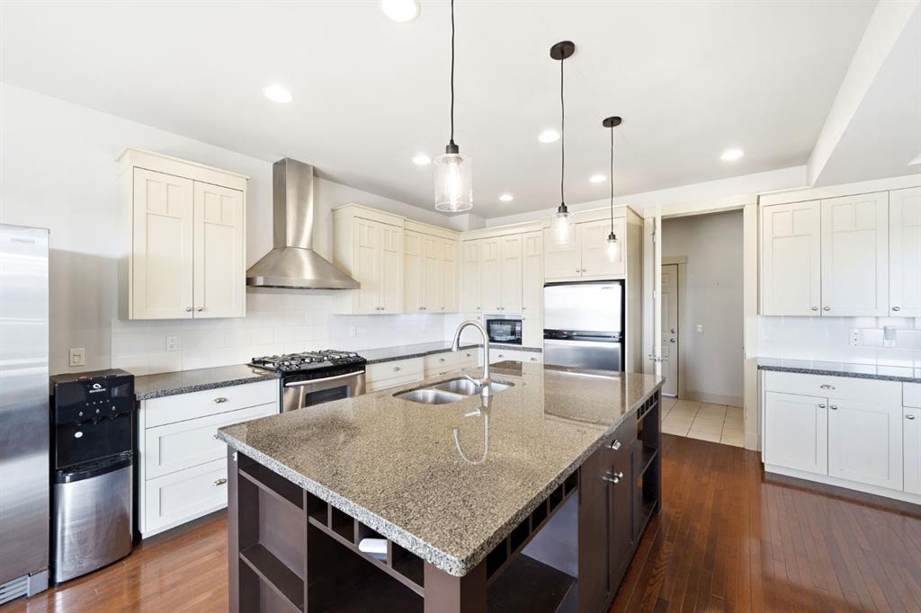 The gourmet kitchen includes a gas cooktop, quartz counters, oversized island with storage, abundant cabinetry, and a coffee station. It flows into the dining area, which opens onto a south-facing balcony, ideal for morning coffee or evening sunsets.