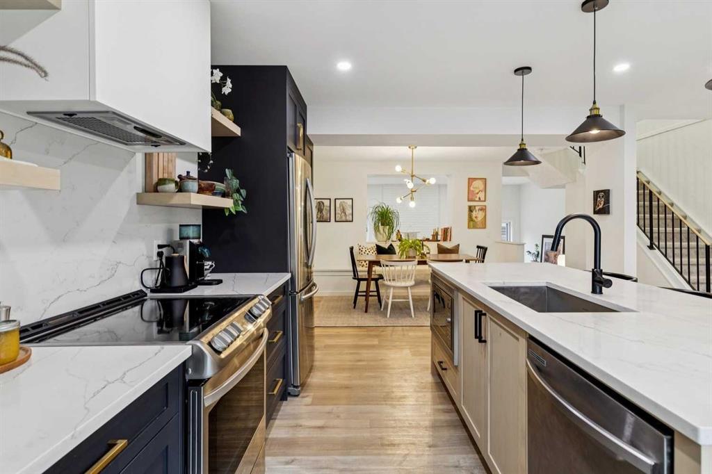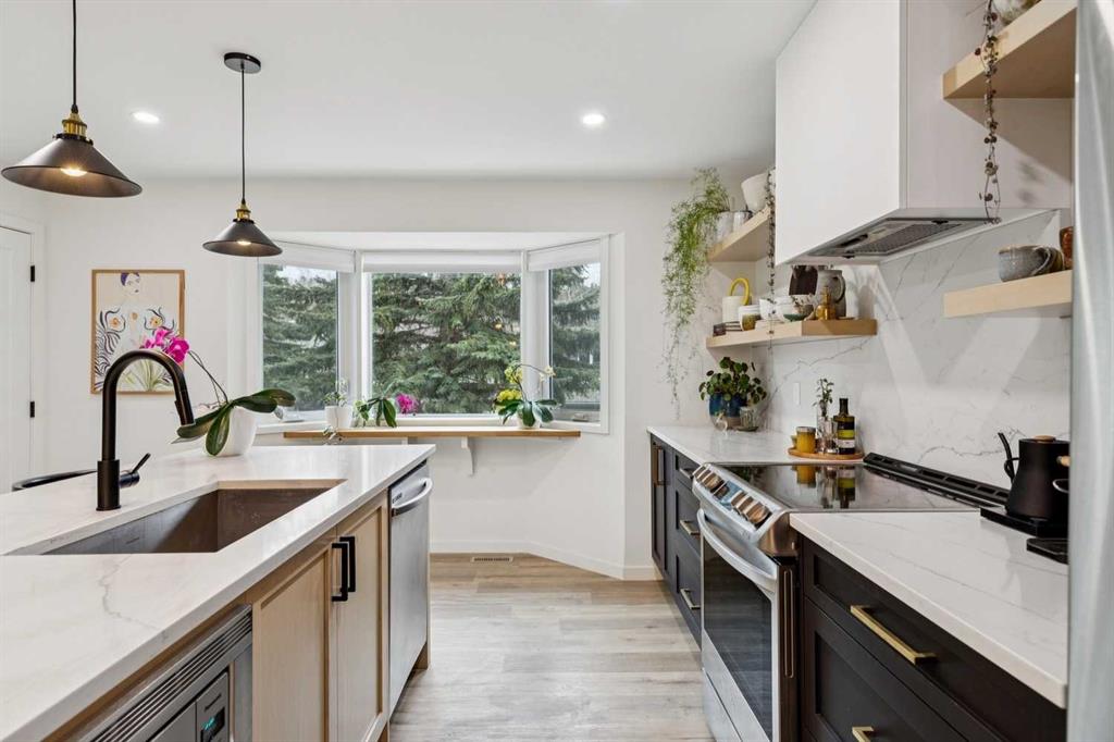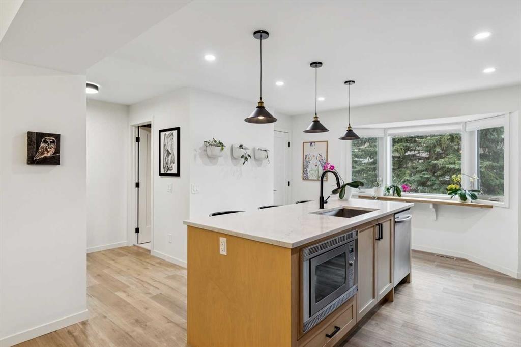 Completely renovated from top to bottom, this high-quality, stylish townhouse offers a rare blend of modern design, thoughtful upgrades, and an unbeatable location with greenspace behind and just one row from the scenic pathways of the Bow River. Featuring a single attached garage with brand-new epoxy flooring and a driveway, this home has been refreshed throughout, including all new windows, creating a truly move-in ready experience. Inside, the main level impresses with a dramatic 2-storey ceiling in the living room, anchored by a cozy gas fireplace and finished with durable LVP flooring, while patio doors lead to a private, FULLY FENCED BACKYARD. The adjacent kitchen and dining area are equally striking, showcasing beautiful updates with a large island with breakfast bar, stainless steel appliances including an oven that has barely been used, stone countertops and backsplash, custom cabinetry, floating open shelves, a large walk-in pantry, and a charming bay window with café-style seating, perfect for morning coffee or a work-from-home nook. The dining space features a custom built-in bench, adding both style and function. Also on this level, the show-stopping half bathroom is beautifully finished with tile flooring, granite countertops, bold black walls, and unique, modern design details with updated fixtures throughout. Upstairs, you will find 3 well-sized bedrooms and 2 full bathrooms, including a spacious primary retreat with a large walk-in closet complete with built-ins, new window coverings, and a private, treed outlook with mature evergreens. The ensuite offers double sinks, granite counters, tile flooring, and a large, gorgeous tiled shower, while the secondary bathroom includes a tub/shower combo and granite countertops. The fully finished basement extends your living space with LVP flooring, laundry, a flex room, and convenient under-stair storage. A welcoming front patio sitting area adds to the home’s charm, while the surrounding community offers a unique, nature-filled setting with mature trees throughout, easy access to downtown, the Children’s Hospital, the Foothills Hospital, and quick routes west to the mountains - making this an exceptional opportunity for those seeking both lifestyle and location. The maintenance fees are some of the lowest in the neighbourhood!