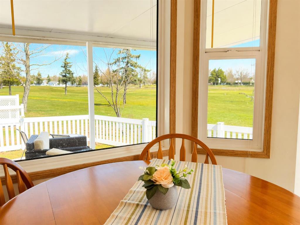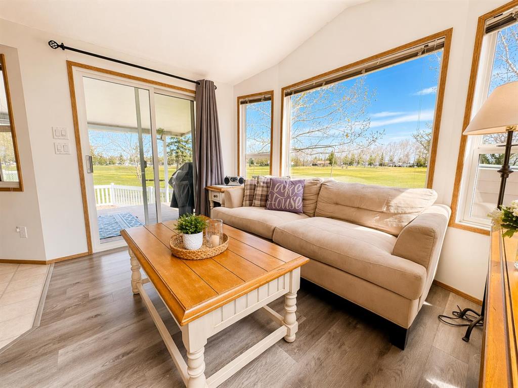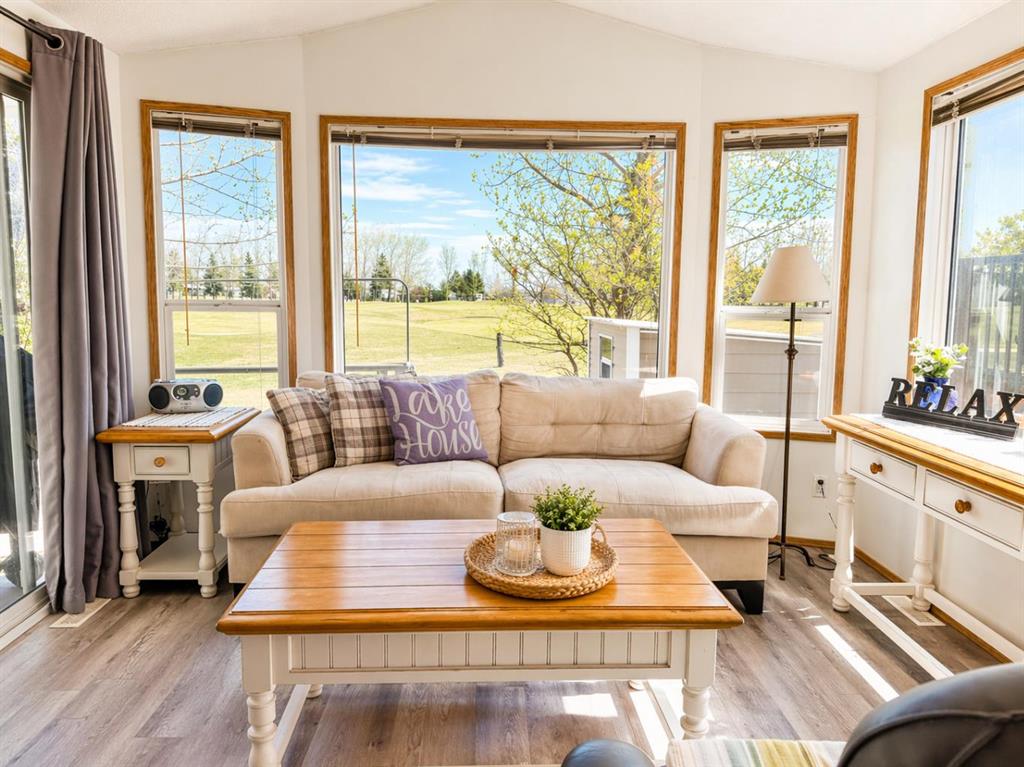 Located in the gated, four-season community of Gleniffer Lake Resort, this property offers the full resort lifestyle with access to a 9-hole (36 par) golf course, marina, indoor and outdoor pools, hot tubs, fitness center, pickleball courts, restaurant, and clubhouse. Centrally positioned within the resort and just a short walk or golf cart ride to all amenities, this charming 2-bedroom unit backs directly onto the 7th hole and is bordered by green space on one side—an ideal combination of convenience and privacy that buyers in this resort are looking for. Inside, the layout is functional and welcoming, featuring a bay-window dining area that comfortably seats four, a well-equipped kitchen with a 4-burner gas stove, microwave, full-size dishwasher, double sink, and large pantry. The primary bedroom offers a queen bed with generous storage, while the second bedroom includes a queen with a single bunk above—perfect for family and guests. A spacious 4-piece bathroom adds everyday comfort. The largest hall closet is plumbed and waiting for you to add your own washer/dryer or you can use the coin operated laundry at the clubhouse. A bright sunroom addition provides flexible space to relax or entertain, while the covered rear deck offers a private vantage point overlooking the golf course. The fully fenced yard is ideal for pets or kids, and the low-maintenance landscaping means more time enjoying everything the resort has to offer. Extras include all indoor and outdoor furnishings, kitchenware, all draperies, central vacuum with attachments, a BUNKHOUSE for extra guests, storage shed, BBQ, lawnmower, and a golf cart—making this a true turn-key opportunity. Ample parking allows for two vehicles plus golf cart(s).