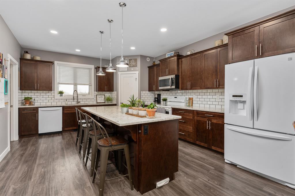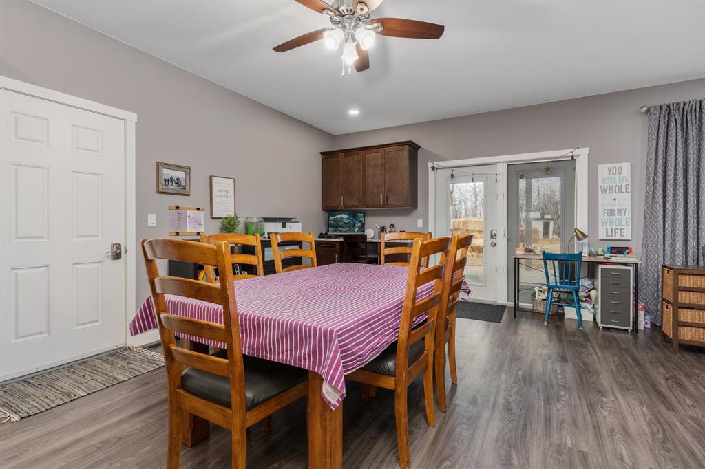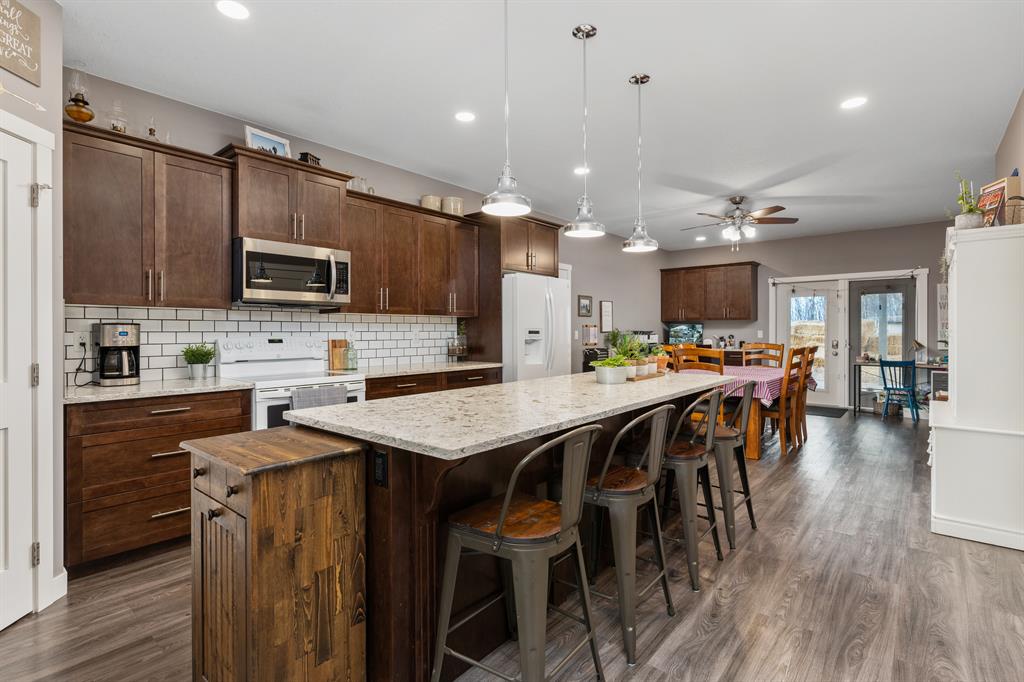 Outstanding acreage living in this immaculate sprawling bungalow located only 15 minutes from Camrose! This home checks all the boxes! This 1972 square foot home is fully finished with an oversized attached double garage, sits on just over 9 acres of land, with highway access, and boasts a 40 x 60 fully finished work shop with 3 bay doors! You and the family are going to absolutely adore this beautiful home from the moment you walk in the front door with its spacious entry that leads right into the large living room with gas fireplace that looks upon your cavernous covered patio with natural gas hooked up for your BBQ. In the dining area you’ll find lots of room for a large dining table and a built in desk which also currently houses the security system. A 10 foot long island with breakfast bar centers the kitchen that showcases a large corner pantry and a wealth of cabinets, drawers and counter space that will make large dinners a breeze. Off of the kitchen, is main floor laundry and a two piece bath. On the other side of the kitchen is access to the heated double garage which features a large mud room for all the kid’s jackets, bags and hockey gear! On the main floor you’ll also find the massive primary bedroom that holds a 3 piece en-suite and walk-in closet. Along with the primary bedroom, there are two generously sized bedrooms and a 4 piece bath. As you head into the fully finished basement you’ll love the gigantic family room and the two enormous bedrooms! The basement also boasts a 3 piece bathroom, great storage area and a utility room you can actually maneuver in! That is only the house, we can’t forget about the heated 40 x 60 shop with its 3 bay doors with space for all the toys and a convenient loft for storage. This shop also holds the two large cisterns for the home so you never have to worry about the well freezing up. In the front yard, you’ll enjoy all the green space, a small dugout and multipurpose concrete pad with in-floor heat, which is also in the house, that has been used to hold a swimming pool in the summer and a small skating rink in the winter. With a large tree house in the back, a private hot tub set up behind the home and all the space for activities while being only 15 minutes from Camrose; this is the perfect family home for you to live, work and play!