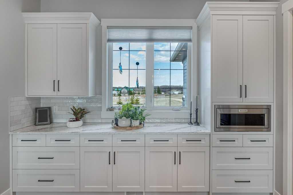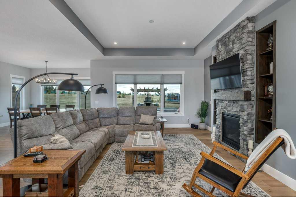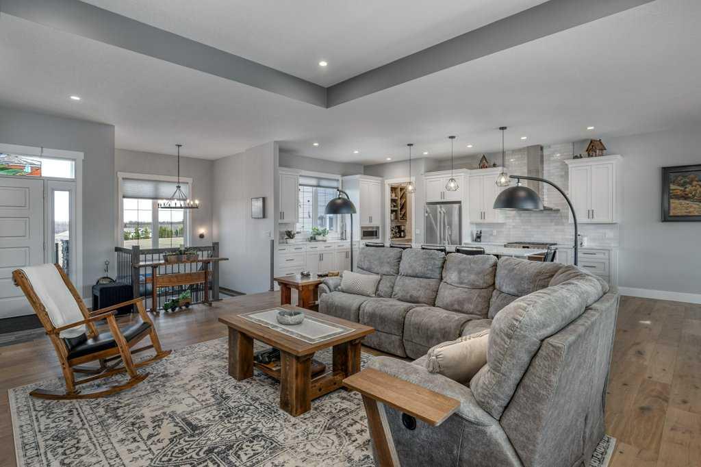The main level features a stunning open-concept design with 10-foot ceilings, anchored by a showpiece kitchen with a massive quartz island, 6-burner gas cooktop with electric oven (dual fuel), KitchenAid fridge and dishwasher, and a slim-profile microwave. A butler’s pantry with custom millwork adds both function and elegance. The dining area flows into the inviting living room with a tray ceiling and gas fireplace, while engineered red oak hardwood flooring adds warmth throughout. The primary suite offers a spa-inspired ensuite with soaker tub, heated floors, and oversized glass shower. A second main-floor bedroom with a 3-piece bath is ideal for guests. The rear mudroom/laundry/bathroom combination is perfectly suited to acreage living. The covered rear deck features low-maintenance composite decking and Sun Coast retractable screens, creating a comfortable outdoor space to relax or entertain. Enjoy the Arctic Spa hot tub while taking in the peaceful surroundings. All west-facing windows are triple-glazed for maximum efficiency.