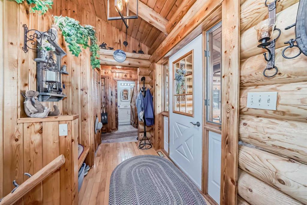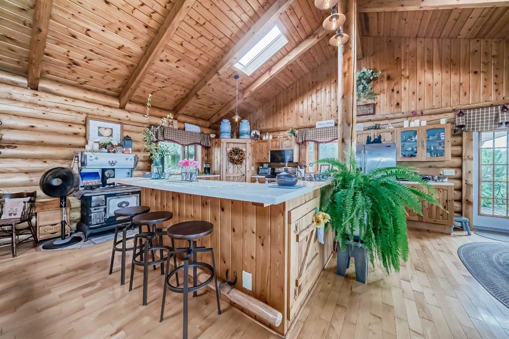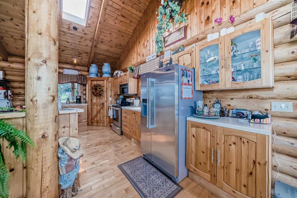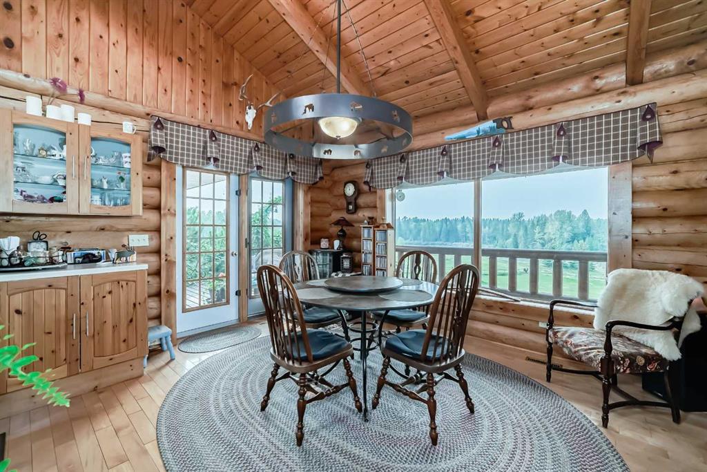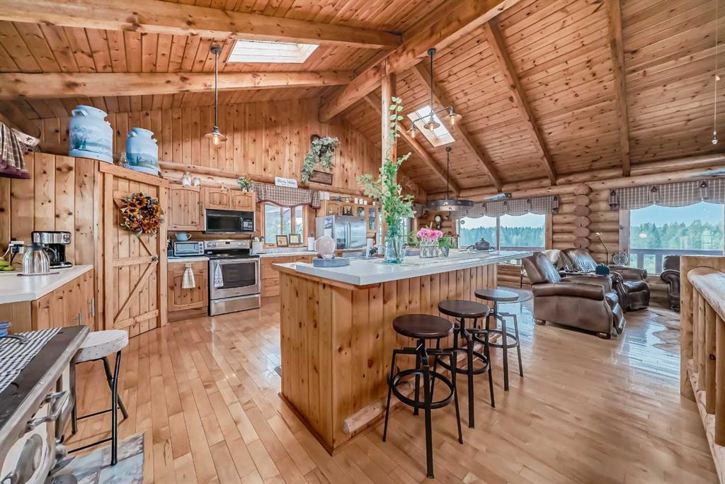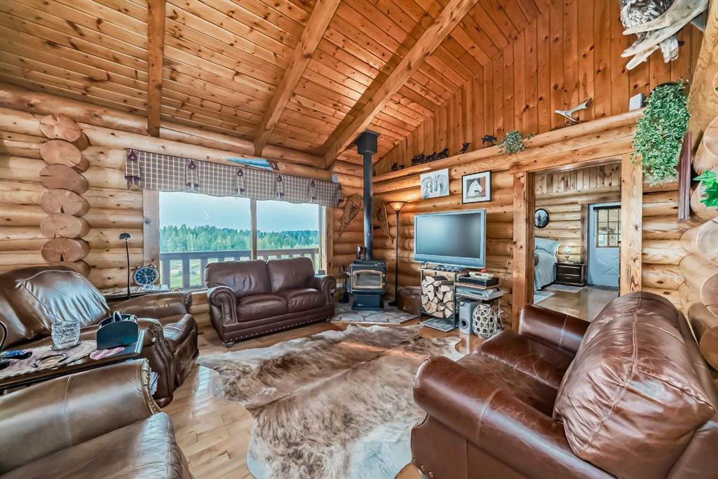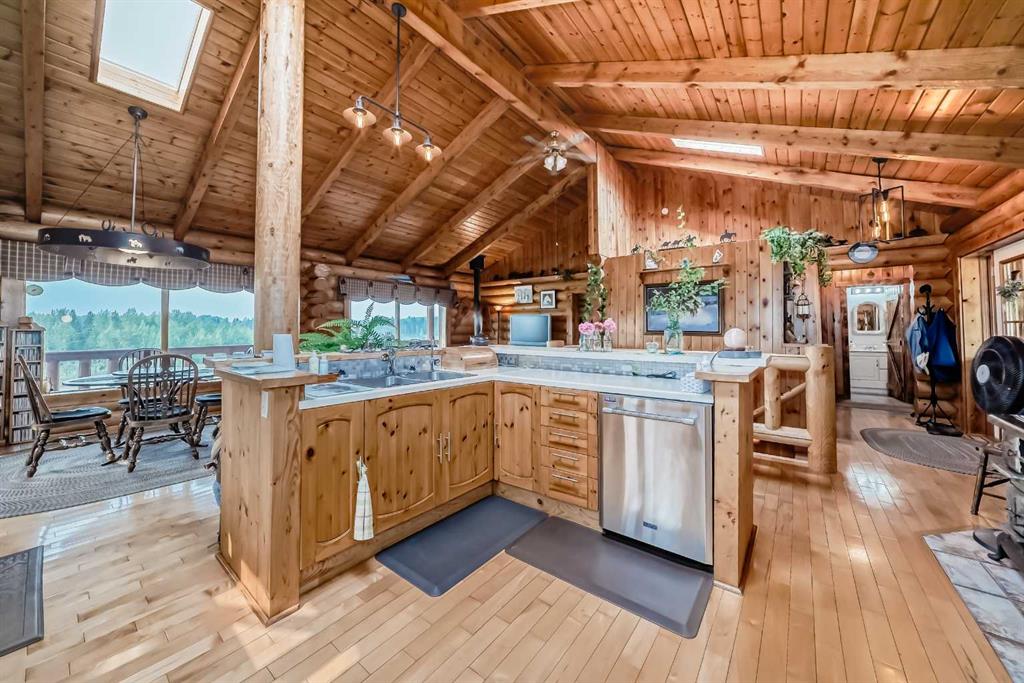 There won\'t be a moment that you won\'t say \"wow\" to this award winning acreage when you drive into this sensational property located on pavement at the end of a dead end road close to Rocky Mountain House and Caroline. Nestled within the trees, this beautiful log bungalow has \"Welcome\": written all over it. From the exceptional landscaping, to the outdoor amenities to the one in a million view of the Clearwater River, this hand crafted log home has been exceptionally built and maintained. The wrap around deck and covered porch leads you into the main living space with a central kitchen area complete with corner pantry and an eating bar for your family to gather for those special events. The living room with woodstove invites you to cozy up for the evening and the convenience of your primary bedroom on main floor shares a luxurious ensuite with a claw tub and heated floors. The sunroom/reading room is located directly off the primary bedroom. The downstairs walkout houses 3 bedrooms a large family room with wet bar and both storage and a cold room. Not enough can be said about the parking as there is a heated double attached garage along with a 16 x 48 motorhome garage, and a combination of shop areas which are 8x24,12x32,14x32,24x32 and 32x32 and 8x14. Shop comes with an air compressor that is plumbed in. Also there is an overhead crane and welder plugs. There is a hayshed, gazebo, fruit trees, grassed pastureland and access to the river. Animal friendly property that has been fenced complete with water bowl. This is one of those properties that needs to be seen to truly be appreciated.
