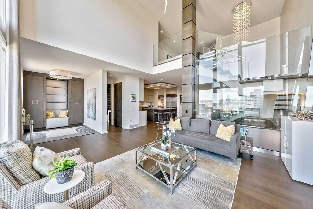 The upper levels offer a private retreat, highlighted by a luxurious primary suite and an additional lounge space framed by breathtaking two-storey windows and panoramic city views. Two generously sized bedrooms, each with its own ensuite and outdoor patio, complete the top floor, with flexibility for custom configuration.