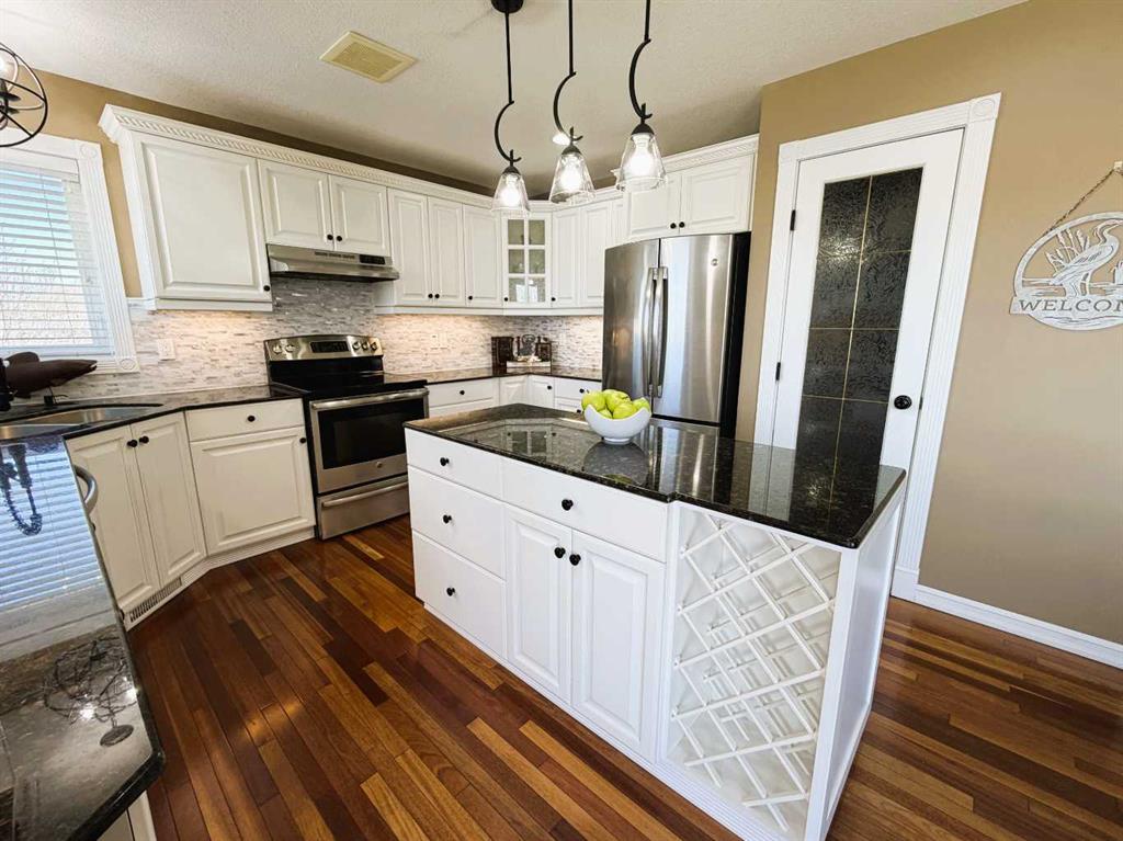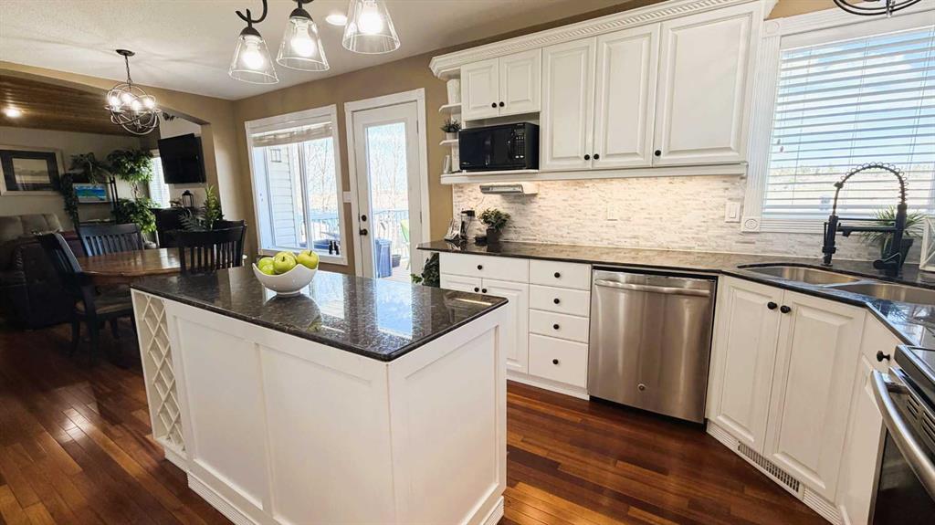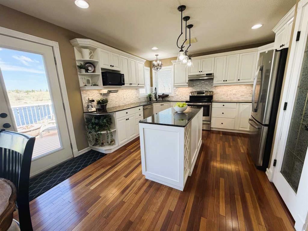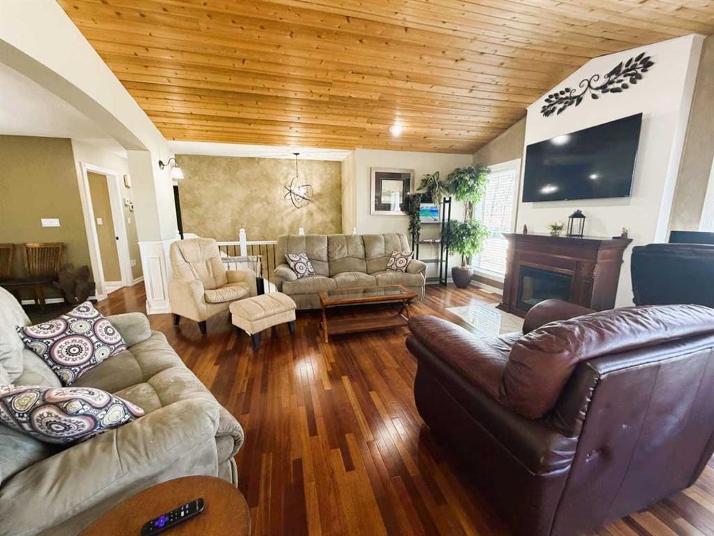 A sizable second bedroom is accompanied by a fully updated main bath with elegant finishes. The lower level contains two additional large bedrooms, a tiled three-piece bath, and a substantial family room with a wood-burning stove that efficiently heats the entire lower floor if needed. A convenient walk-out allows easy access to the expansive backyard, ideal for family activities and outdoor enjoyment. The C-can has electricity in it and has extra room for your tools, toys or whatever you might need. The 3 car garage is heated and there’s plenty of extra space for your RV, extra vehicles & more! Whether you’re skating on the pond in the winter or paddle boarding in the summer, you’ll never be bored!